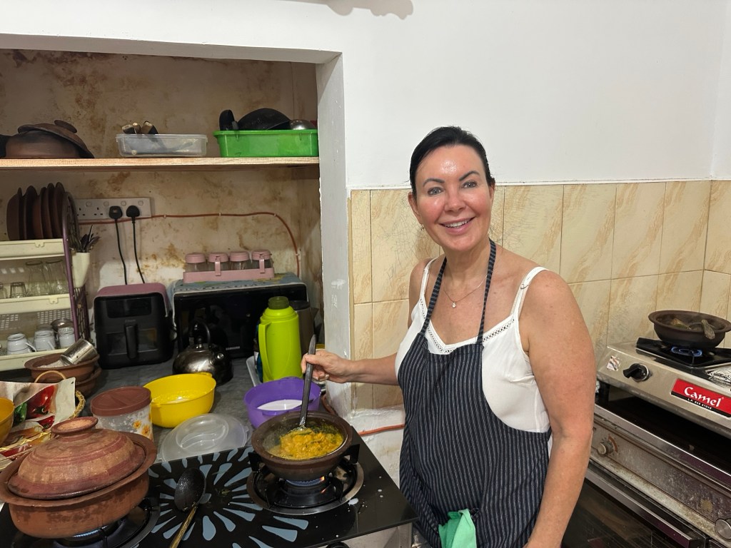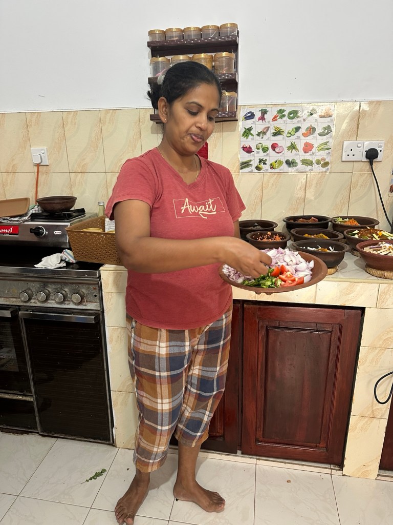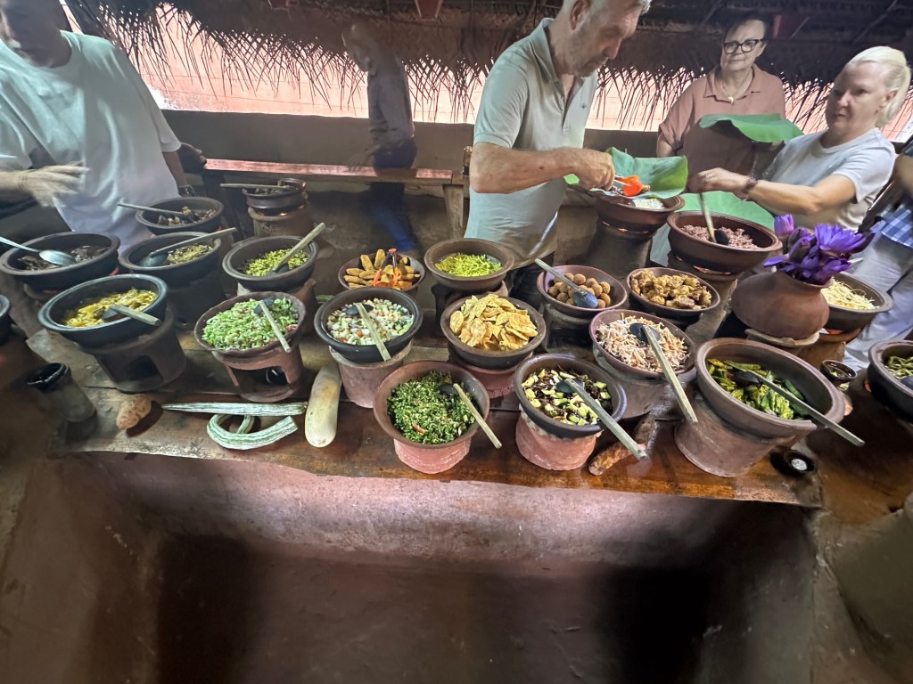 It turned out we were in good company — seven of the nine people from our Bunnick group were there. The class itself was fantastic. We grated coconuts and made fresh coconut milk from scratch, chopped mountains of vegetables, and learned the secrets behind several traditional Sri Lankan curries. The classic pol (coconut) sambal is made from chilli powder, chopped onions, grated coconut and dried and powdered fish, with a splash of lime. All curries were prepared and cooked in clay pots.