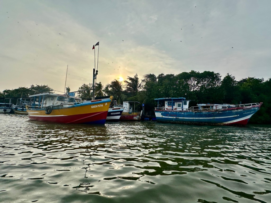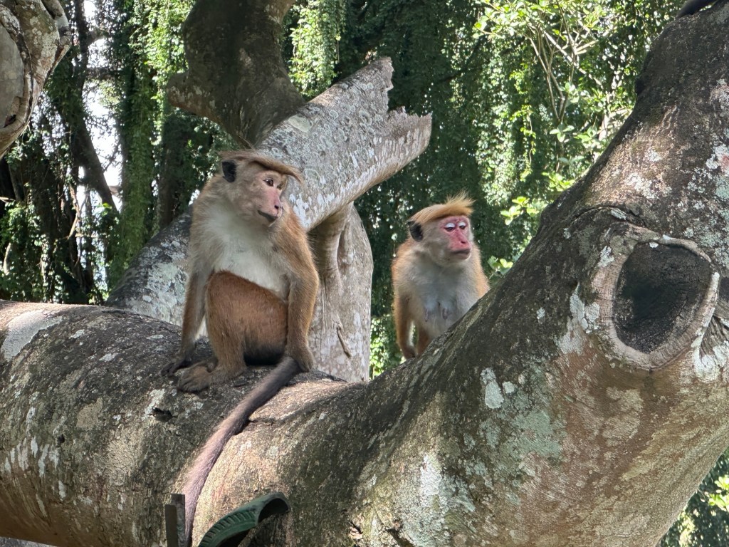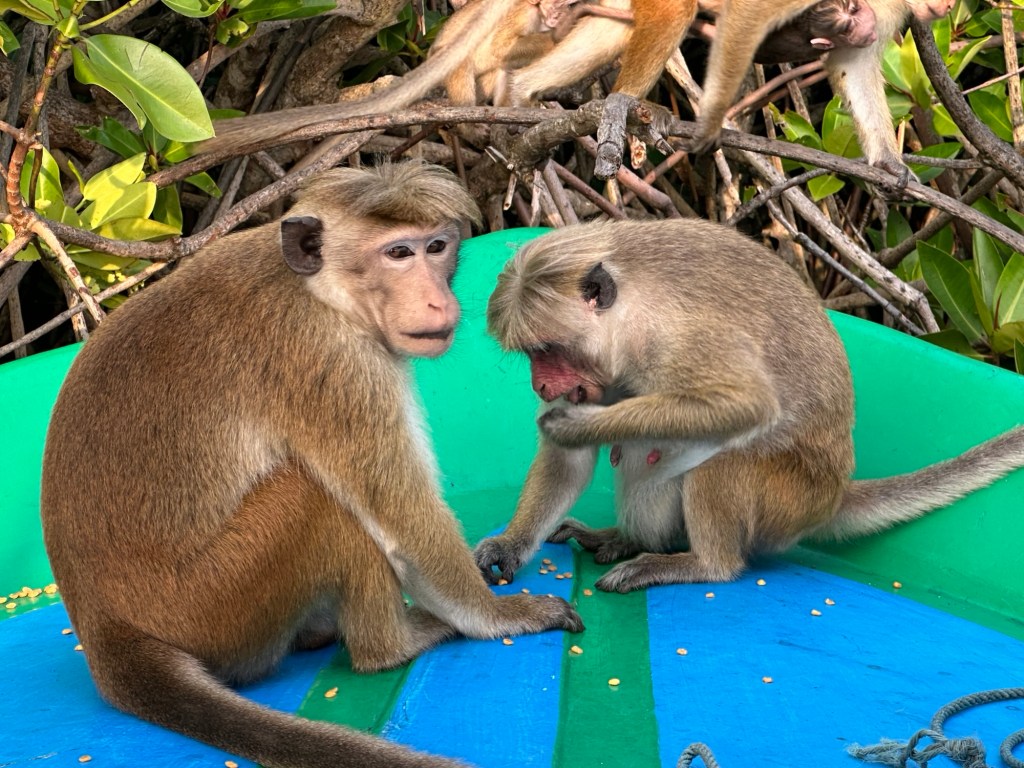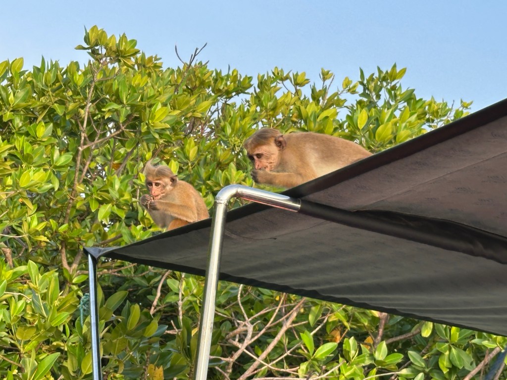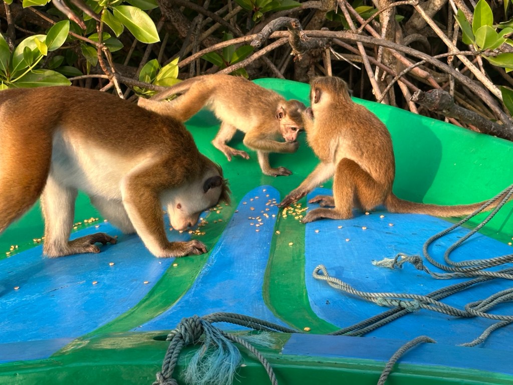 We boarded a small launch and enjoyed a scenic cruise along the jungle fringed Negombo Lagoon at sunset. The marsh’s varied aquatic habitats support a diverse coastal ecosystem. It is home to Eurasian crocodiles, macaque monkeys and water monitors. Many species of butterflies and dragonflies have also been recorded here. Various species of birds, such as kingfishers, and herons call this area home. We were treated to a show by the monkeys – our boat driver put corn kernels on the front of our boat, and before you knew it, we were visited but the friendly creatures – they even climbed onto the roof!