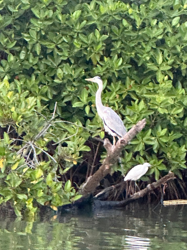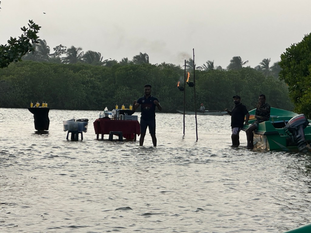 Next we had a surprise – set up in the water between the mangroves were two high tables complete with cocktails containing soda, Arrack (Sri Lankan whiskey) and orange juice – which were delicious, plus plates of sliced pineapple and guava. There were also several lit lanterns which added to the ambience. It was such an amazing experience, standing barefoot in the knee deep water, cocktail in hand, watching the sun set.What a lovely start to our holiday!