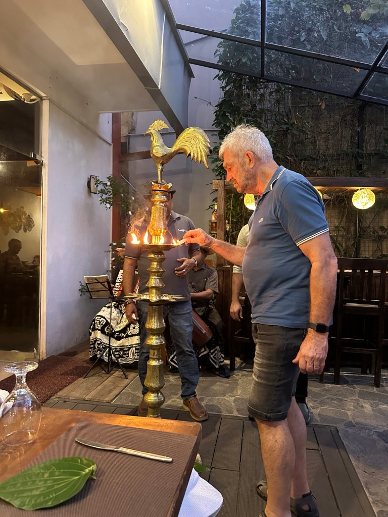 After our cruise, we enjoyed a delicious BBQ dinner at a restaurant on the Dutch canal – we had traditional and local dishes, mostly seafood, whilst listening to a couple of entertaining musicians. We tried the traditional “hopper”, a bowl-shaped pancake, which also has a variation with an egg fried in the centre. Priya made the evening very special by explaining the traditions of lighting candles, and also getting the musicians to play both the Australian and Sri Lankan national anthems.
