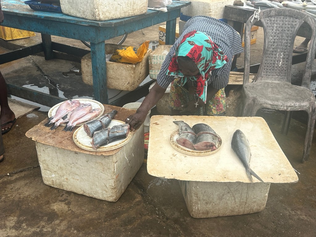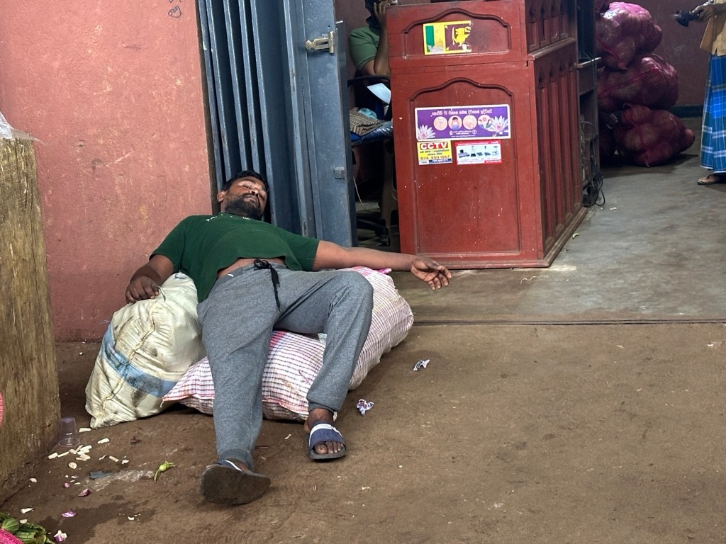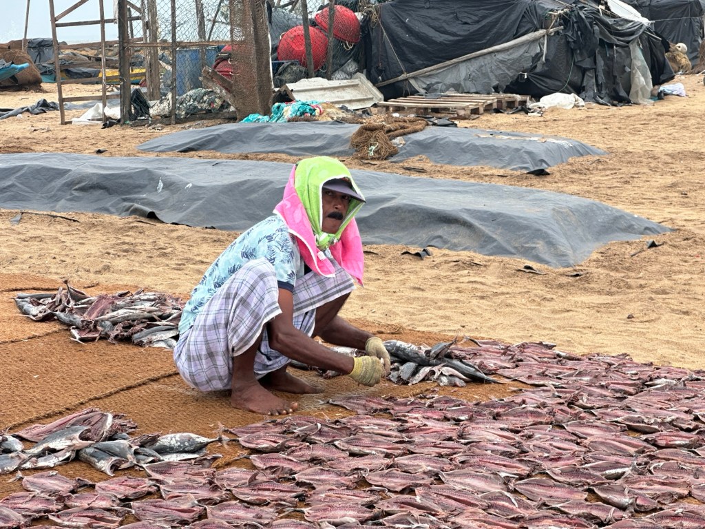 Dried fish is also sold. The fish is heavily salted and spread out on sheets to dry. Women turn the fish every two hours until it is dry. It is packaged for domestic sale, all over Sri Lanka and some for export. Street dogs and cats wander around, but will not touch the fish due to its saltiness. Needless to say, the fishy smell was a little overwhelming!
