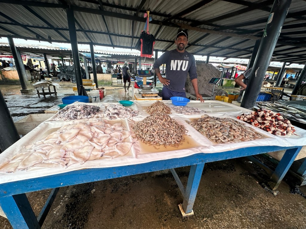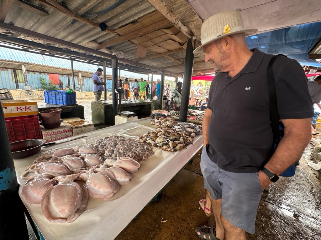 After leaving the hotel we experienced one of Negombo’s fish markets. The market is full of life and colour, as each morning fresh catch is brought in and vendors voice their prices at the top of their lungs. Buyers bargain for the best deals in what is a daily practice for the locals of this coastal town. All types of fish are for sale – tuna, king fish, queen’s fish, Mari Mari, white bait, sword fish, leather jacket and more, also calamari, crabs, oysters, mussels and more.