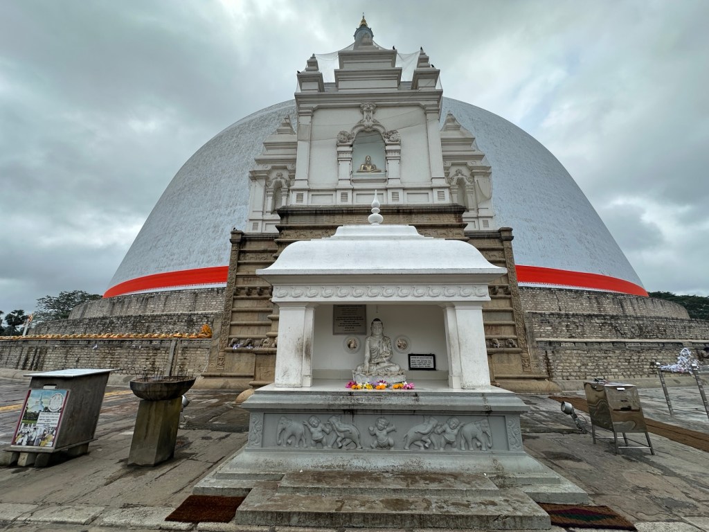 Anuradhapura is one of the ancient capitals of Sri Lanka and the capital of the North Province. Founded in the 5th Century BC, this UNESCO World Heritage listed city is known for its many ruins of temples, ancient pools and dagobas. At the centre of Anuradhapura is the majestic Ruwanwelisaya Dagoba, also known as the Maha Thupa or “Great Stupa”, despite being smaller than the other great stupas. At 55 m high, this is one of the ancient city’s most prominent landmarks. According to legend, the dagoba was originally built in the shape of a bubble but subsequent restorations have changed its appearance. It still stands on an enormous raised platform, however, supported by a striking wall, formed of a frieze of elephants. Four smaller stupas mark the corners of the platform and elaborate shrines (valkahadas) are attached to its base. The stupa is filled with earth. It is painted every year with white chalk.