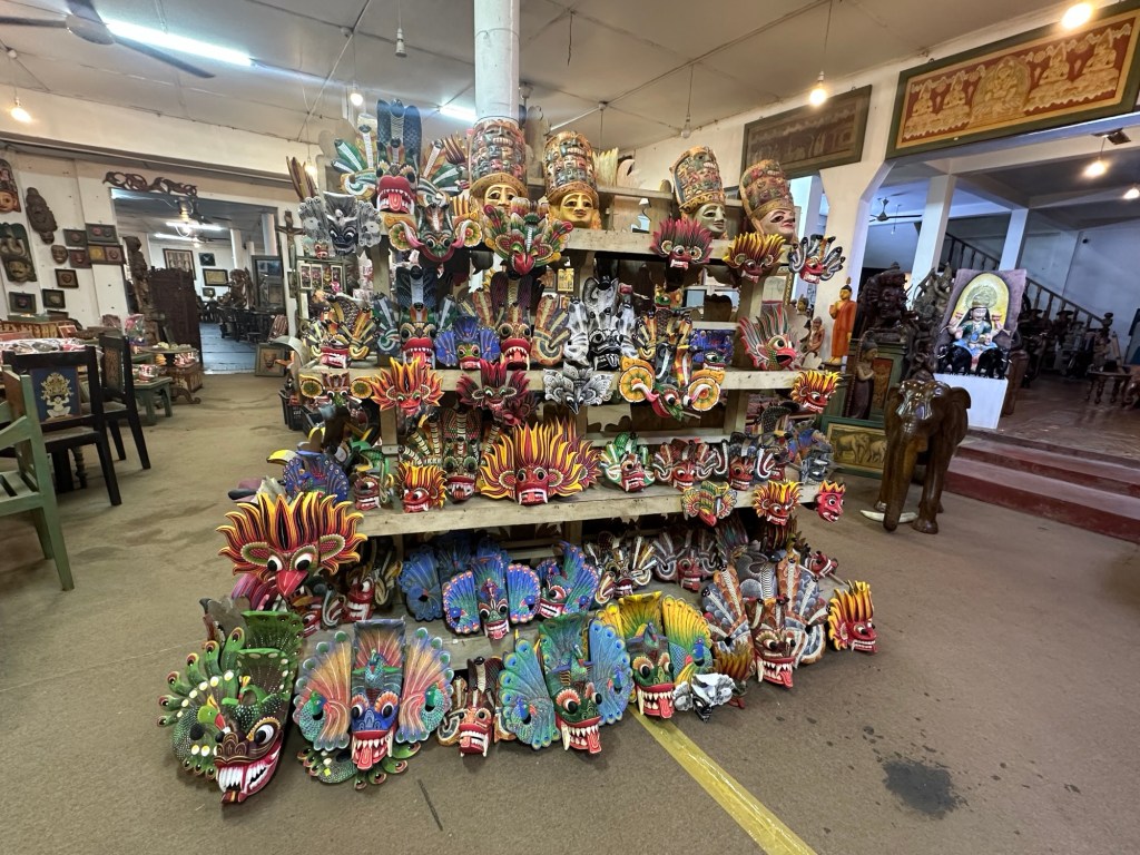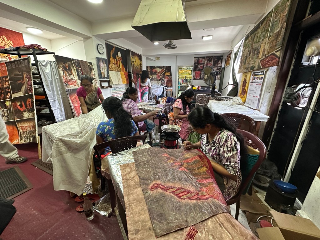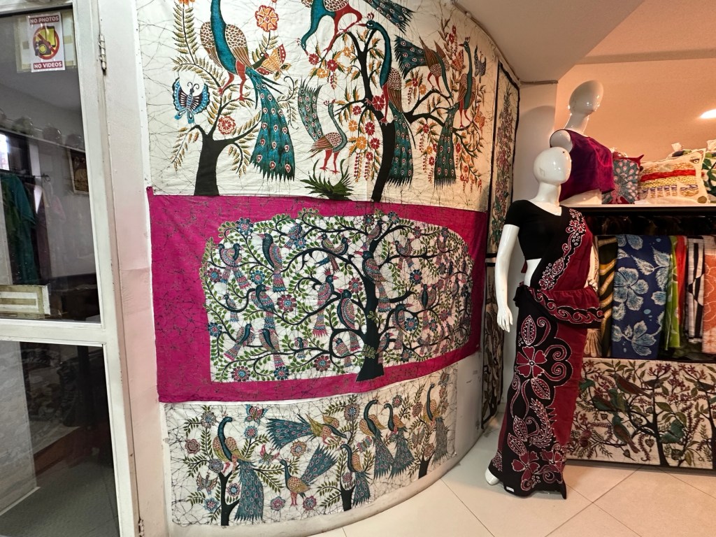 Today we visited a batik factory in Kandy where we learnt about the wax-resistant dying tradition using fabrics. It is a very labour intensive process but with striking results at the end. Each day a different layer of wax is used to make the different coloured patterns. All types of batik and tie-died clothes were available for sale, as well as tablecloths, table runners, cushion covers, wall art and more.