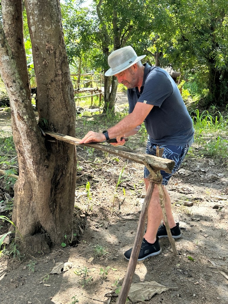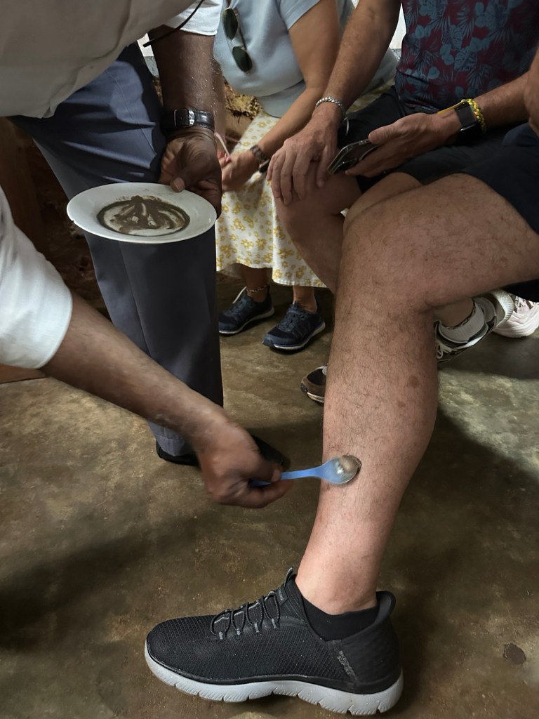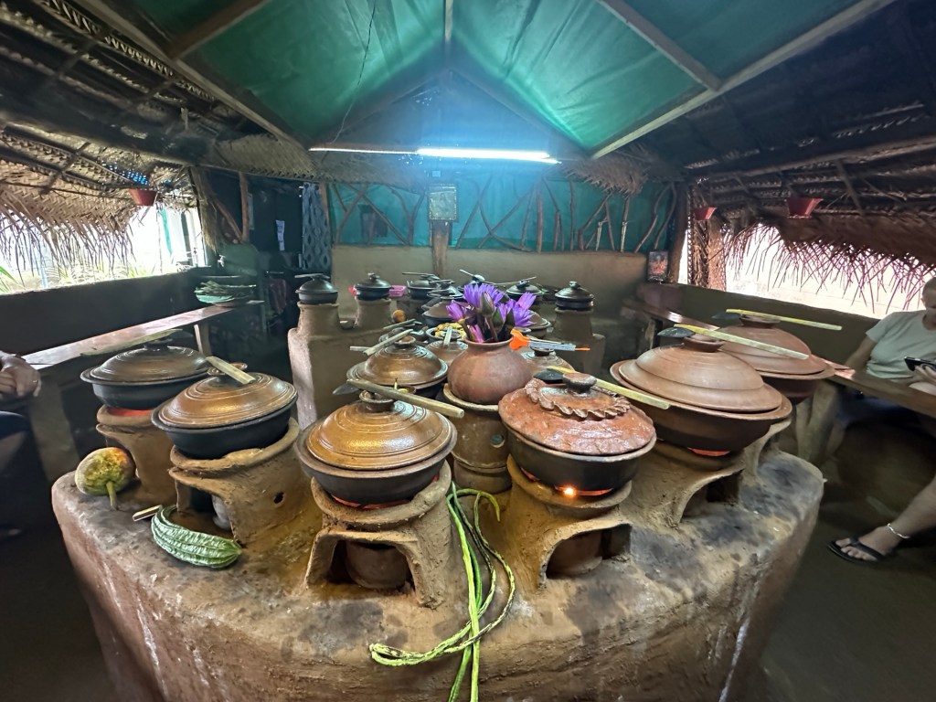Priya took us for a walk around the village- we walked through farms giving us a good understanding of their traditional farming methods, saw the process of millet being made into flour, watched rice being de husked, the making of coconut roti, also how to sharpen knives using sand and teak. We then enjoyed a traditional lunch cooked by the local families – again served from clay pots onto banana leaf lined clay plates.It was a lovely experience, and great to know that the families benefit from us visiting them.