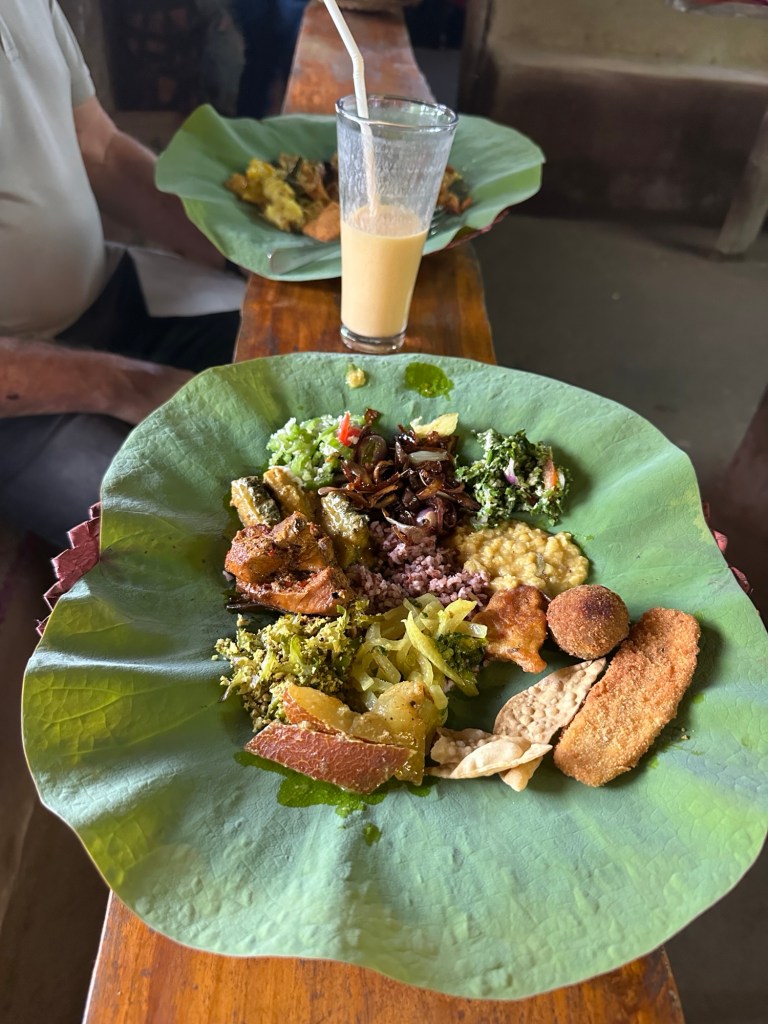 Once we had finished our visits to the archaeological sites in Polonnaruwa, we had a delicious traditional lunch at a local family home. A demonstration on how to cook pumpkin curry preceded our lunch – a choice of 27 dishes, each one bursting with regional spices and flavours. Accompanied by a mango lassi, we almost rolled out! Our meals were served on bamboo plates lined with banana leaves