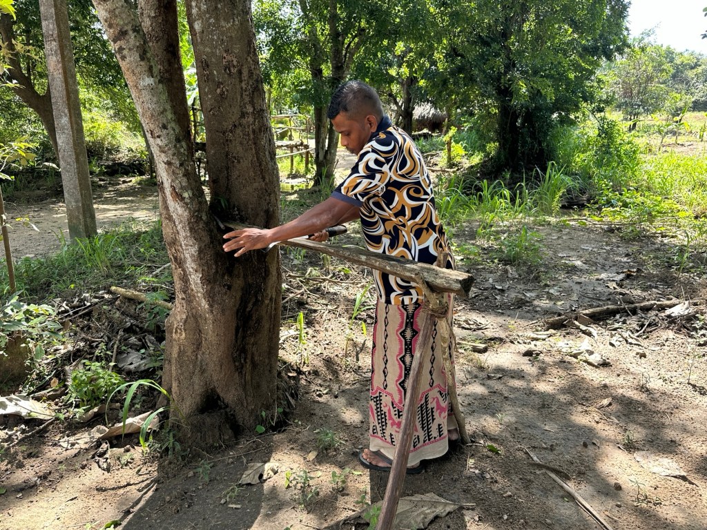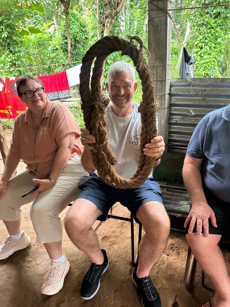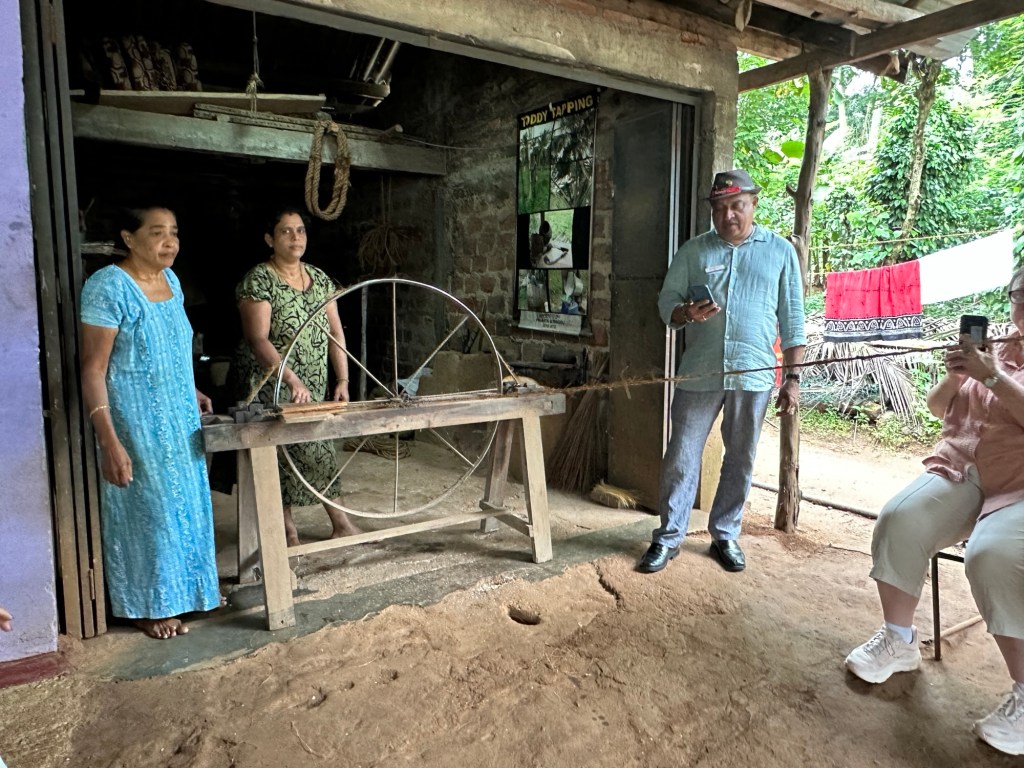 Next stop was Coconut House – here we see how a local family utilises every element of a coconut tree, from extracting coconut oil to creating rope. Coconut milk, coconut oil, treacle, toddy (Arrack) sambol come from the inside of the coconut, whilst the fibre makes rope, mats, and brooms. The coconut shells make garden edges, cups, bowls, spoons – nothing is wasted. No wonder they call it the tree of life.