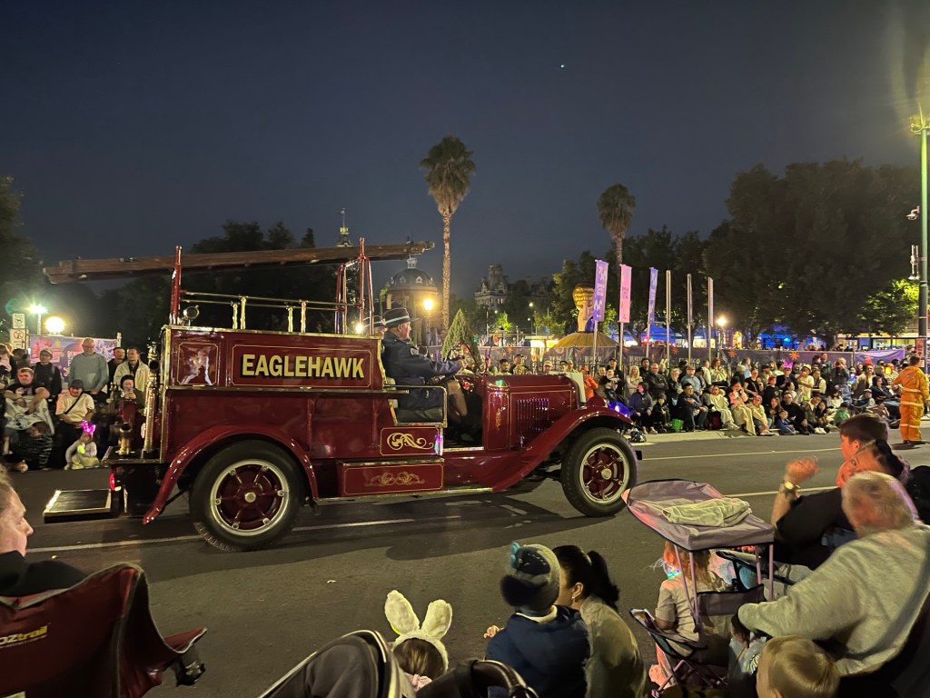 The finale for the day was the Torchlight Parade. People had their chairs in place from midday. The procession featured illuminated entries from local emergency services, community groups and the Bendigo Chinese Association. All we saw was the many fire trucks – it became a bit repetitive, and Isla had lost interest, so time to call it a night and make the drive back to Heathcote.