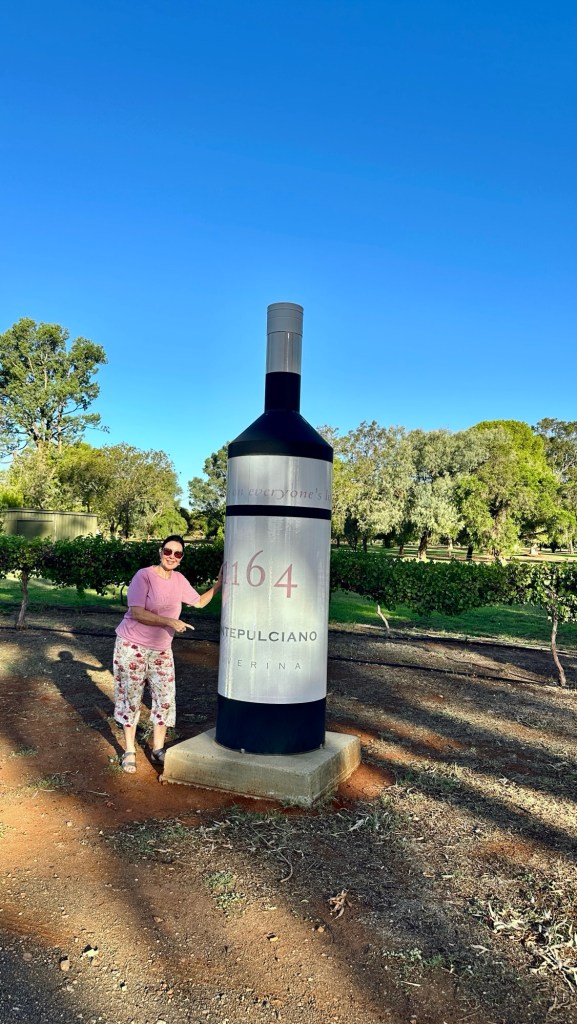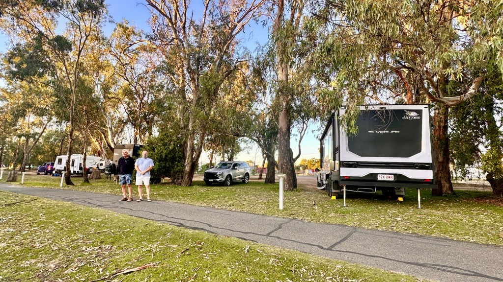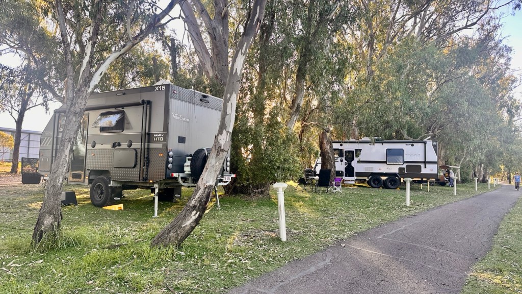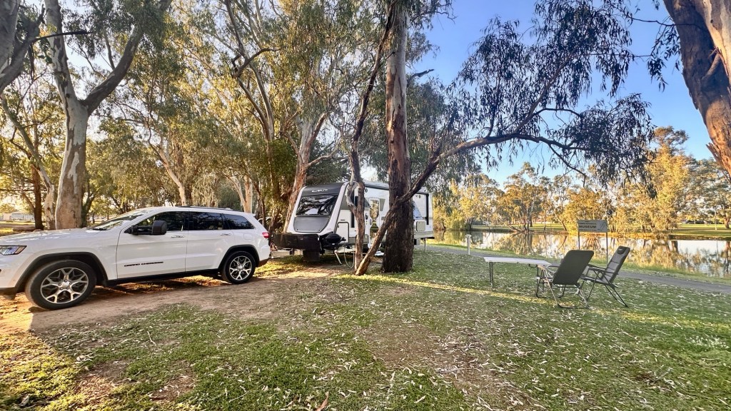 Another half hour’s drive through rich farmlands and we arrived in Griffith. This Riverina region of NSW is known as the ‘food bowl’ of the state for good reason. Produce thrives here, and much of it envelops Griffith, from grapes to oranges and everything in between. We checked into the Griffith Caravan Village Park – a bonus was the drive through sites.