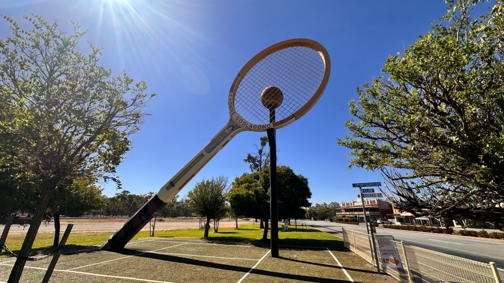 Half an hour later we were in Barellan – the home town of tennis great Evonne Goolagong-Cawley OAM. The Big Tennis Racquet, unveiled in October 2009 during the Barellan Centenary celebrations, is a tribute to the former great Australian tennis player. The racquet is an exact 20:1 scale model of Evonne’s battered wooden signature Dunlop racquet.