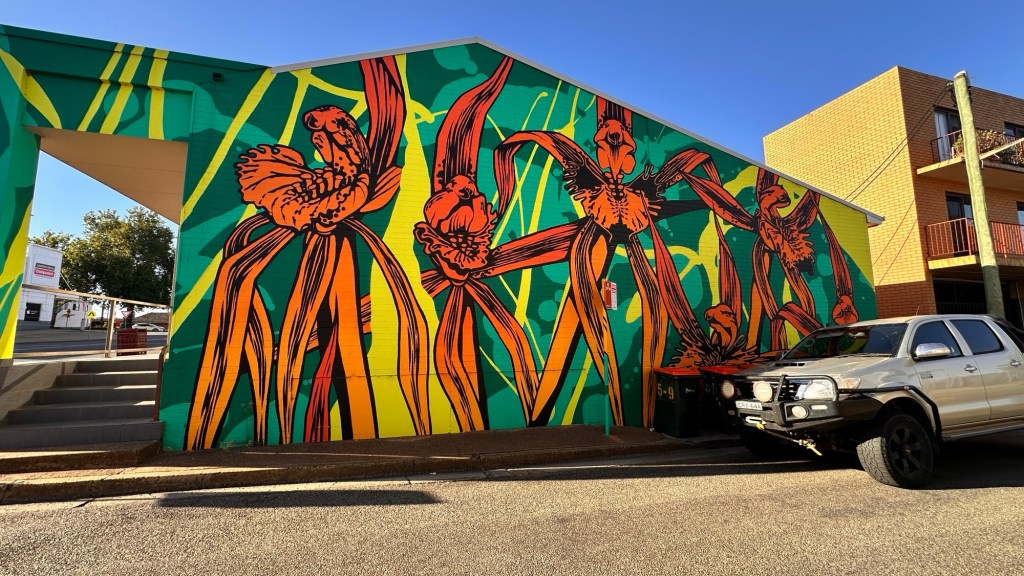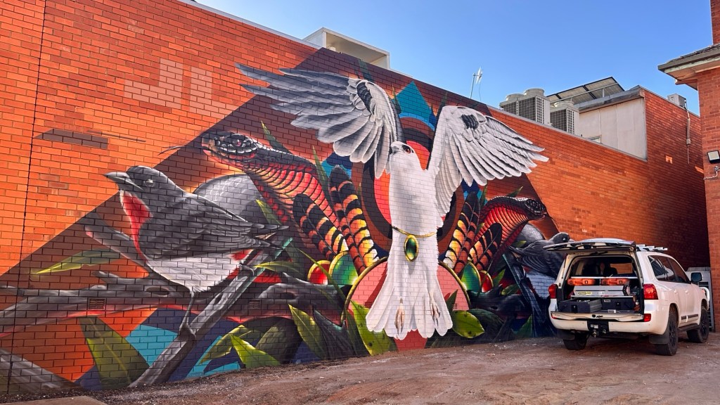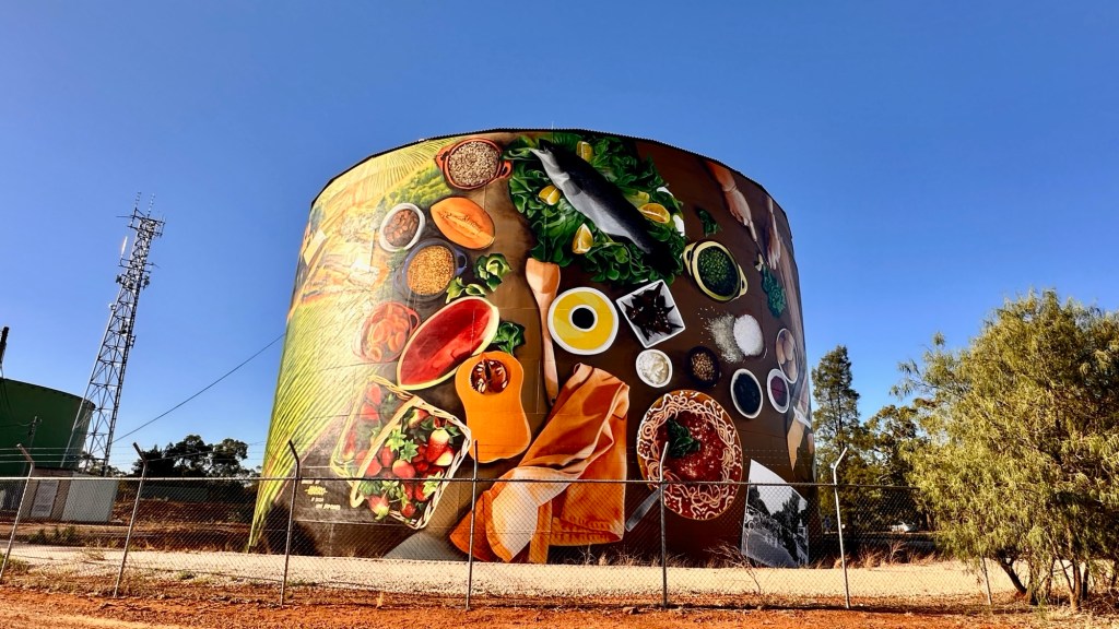 Time to explore the town. Griffith has a vibrant art mural trail. Notable highlights include the striking water tower mural atop Scenic Hill by renowned artist Heesco, which weaves together themes of water, multiculturalism, agriculture, manufacturing, and Indigenous heritage. The trail also features works from the Banna Lane Festival, where over 30 large-scale murals have transformed the CBD into an open-air gallery.