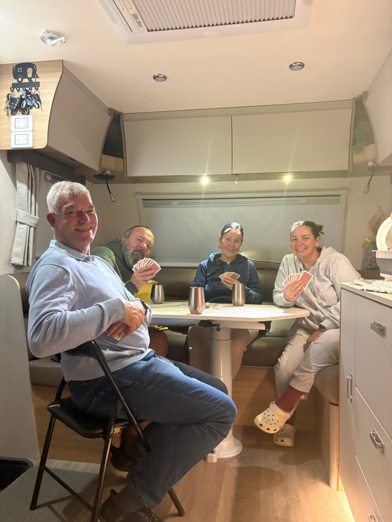 After a leisurely “stumble” back to the caravan park, the afternoon unfolded exactly as it should — unhurried and indulgent. Out came the cards for a few rounds of canasta, accompanied by generous pours of our newly acquired vinos (purely to ensure they travelled well, of course).