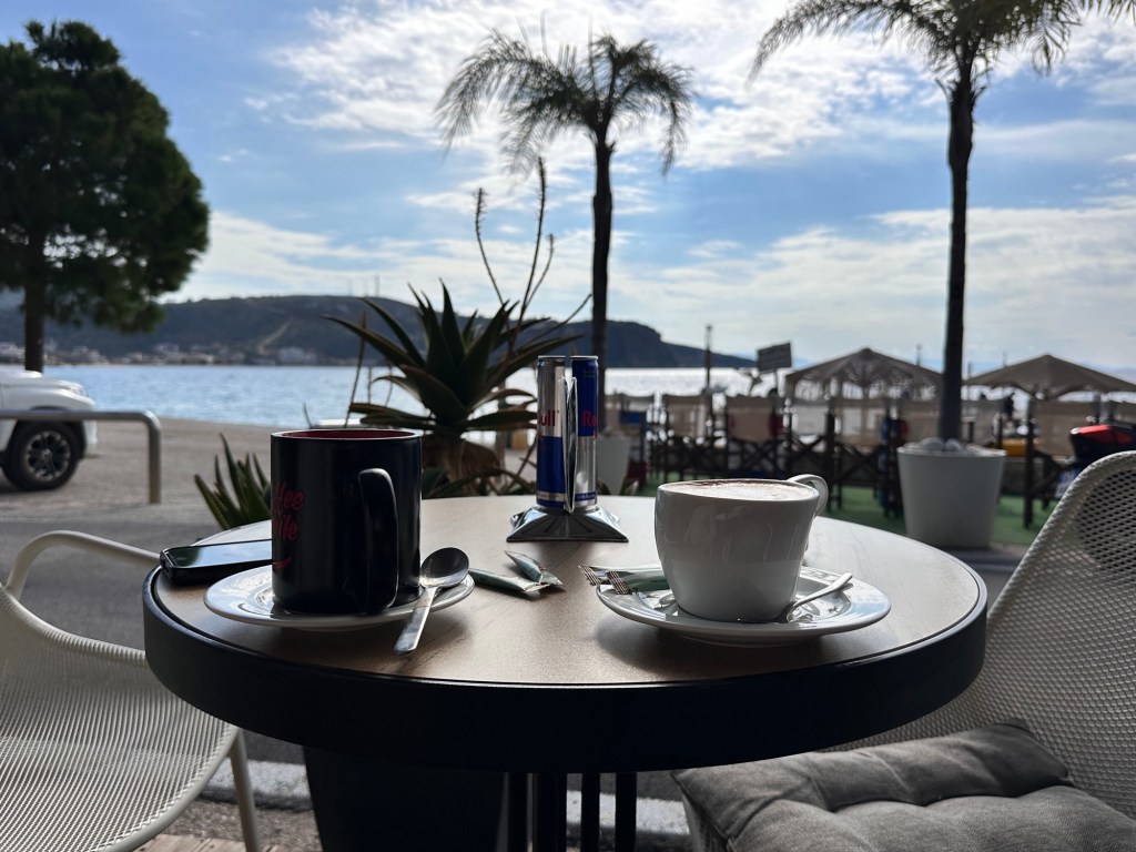 Next we had a coffee stop at the small beach town of Himare. Himarë’s prominent hilltop castle and old town dates back to the Illyrians, who settled in the area around the 3rd century BCE. Down on the seafront, the majority of Himarë’s modern centre was built in the 1960s. A long stretch of coarse-sanded beach fringes the new town, attracting large crowds in summer.