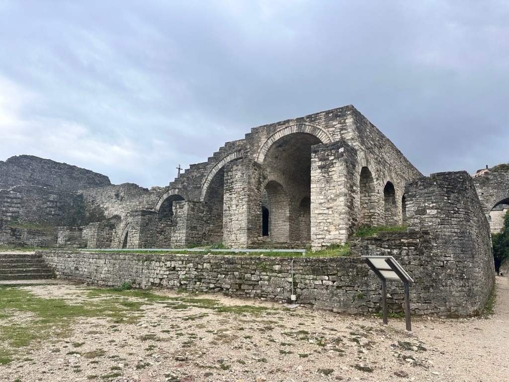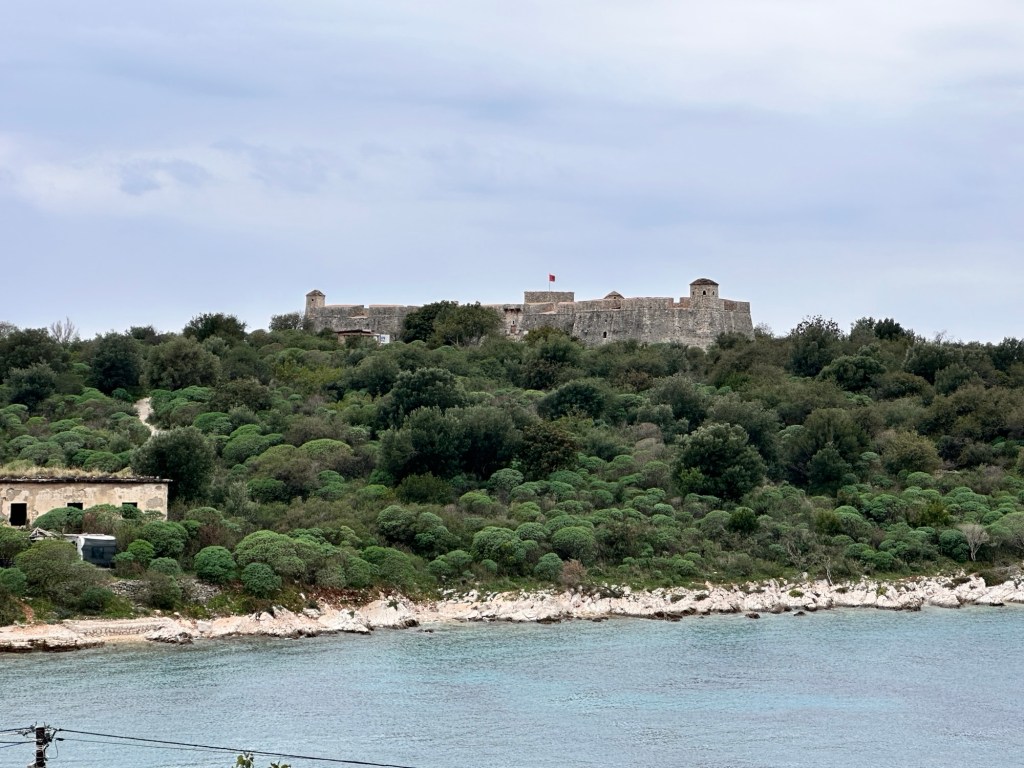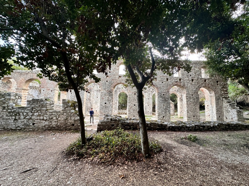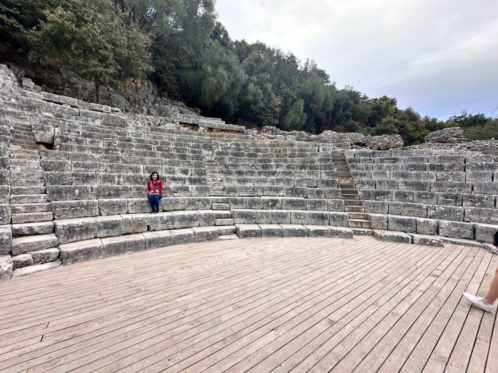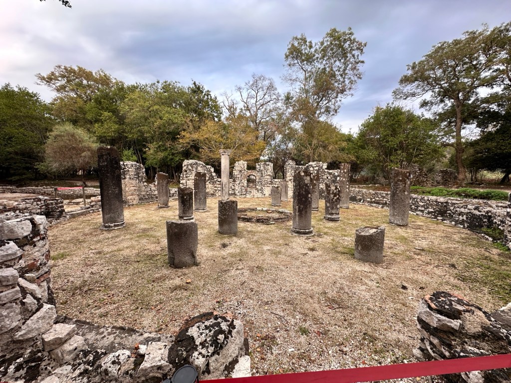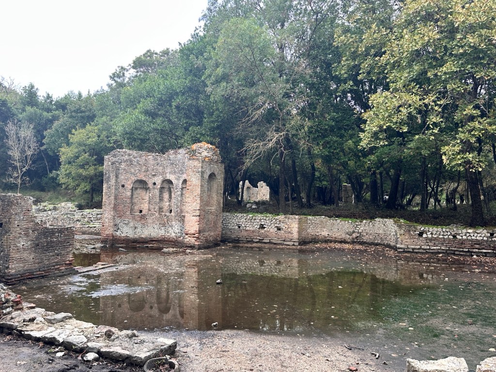 Onto Butrint National Archaeological Park to visit the ruins of the city of Butrint, excavated in 1944. This Greek city and UNESCO World Heritage Site dates back to 8th century BCE, and retains a unique testimony of Hellenistic, Roman, Byzantine, Venetian and Ottoman cultures and civilisations. After the city was flooded during an earthquake, Butrint was abandoned and laid untouched for years under the mud and debris from the quake, preserving artifacts and protecting the ruins. We had a fascinating tour putting the pieces together of this ancient city – Roman baths, amphitheater, gymnasium, baptistery, fountain, the Great Basilica, Venetian castle and tower. Very interesting.
