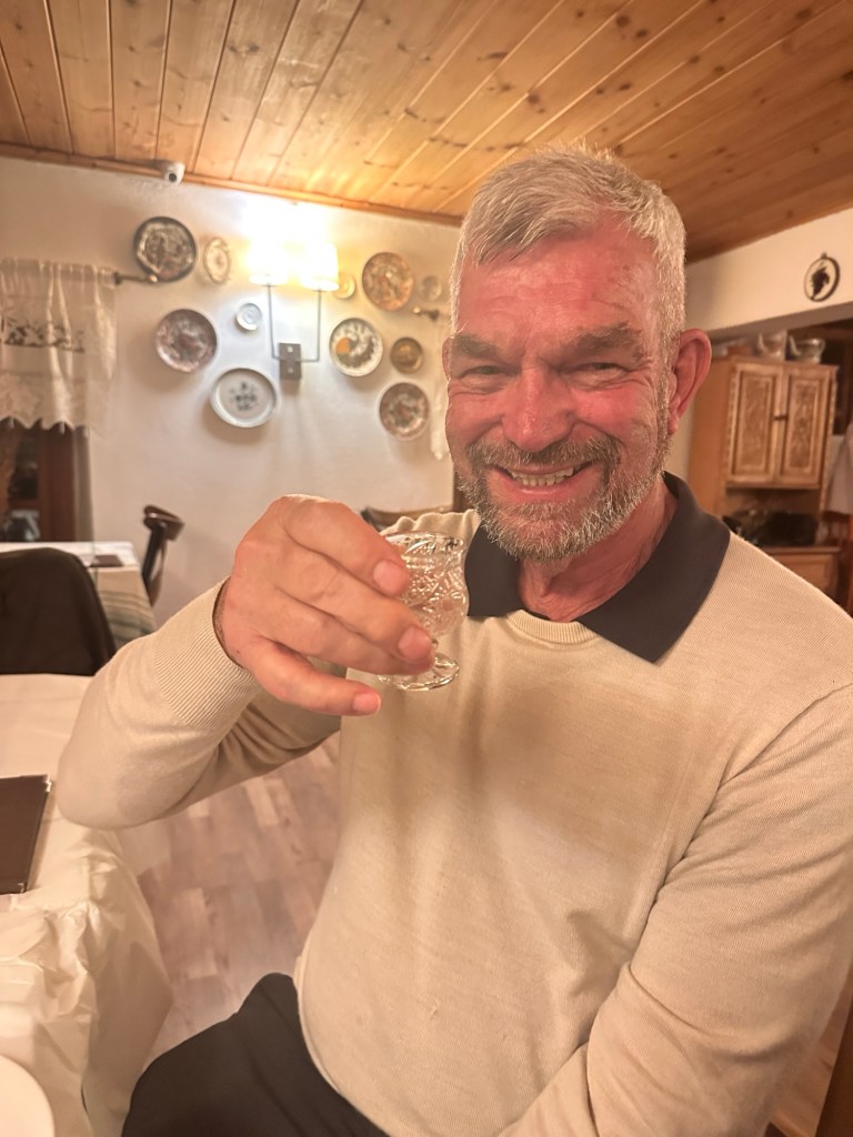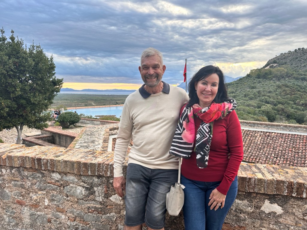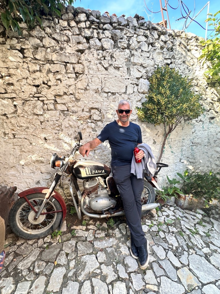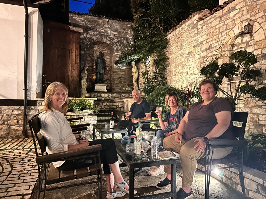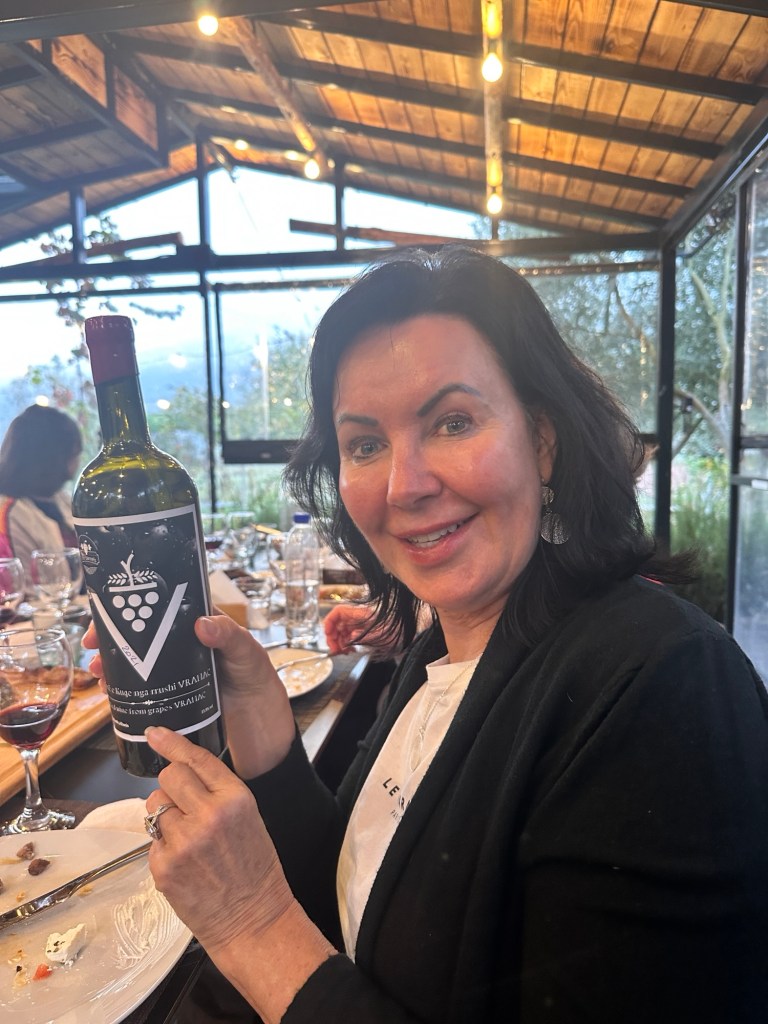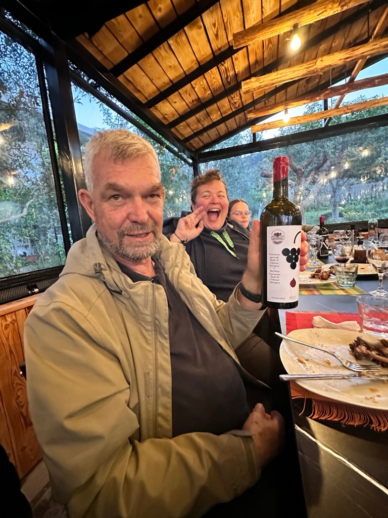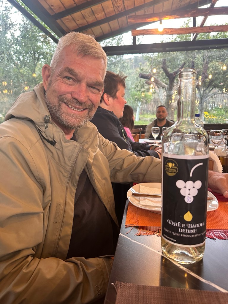 At 4pm we transferred to a local vineyard, passionately run by a family deeply rooted in winemaking, traditional rural cuisine, and hospitality. This was our Albanian foodie moment. We had tastings of both white and red wines, each paired with regionally sourced accompaniments and fresh farm fruits. A bonus was some raki at the end – local liqueur made from grapes, and is 45-50% alcohol. Not for me! Frank of course liked it! Raki is meant to be sipped – this allows the tongue to register its heat and fruity flavour.