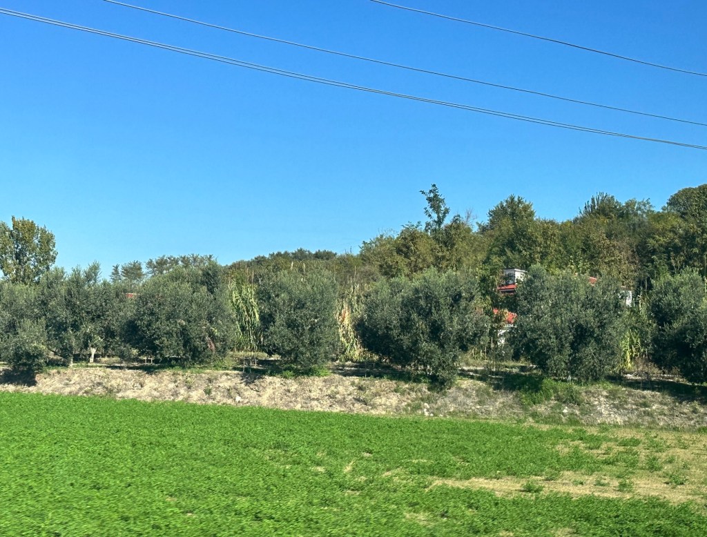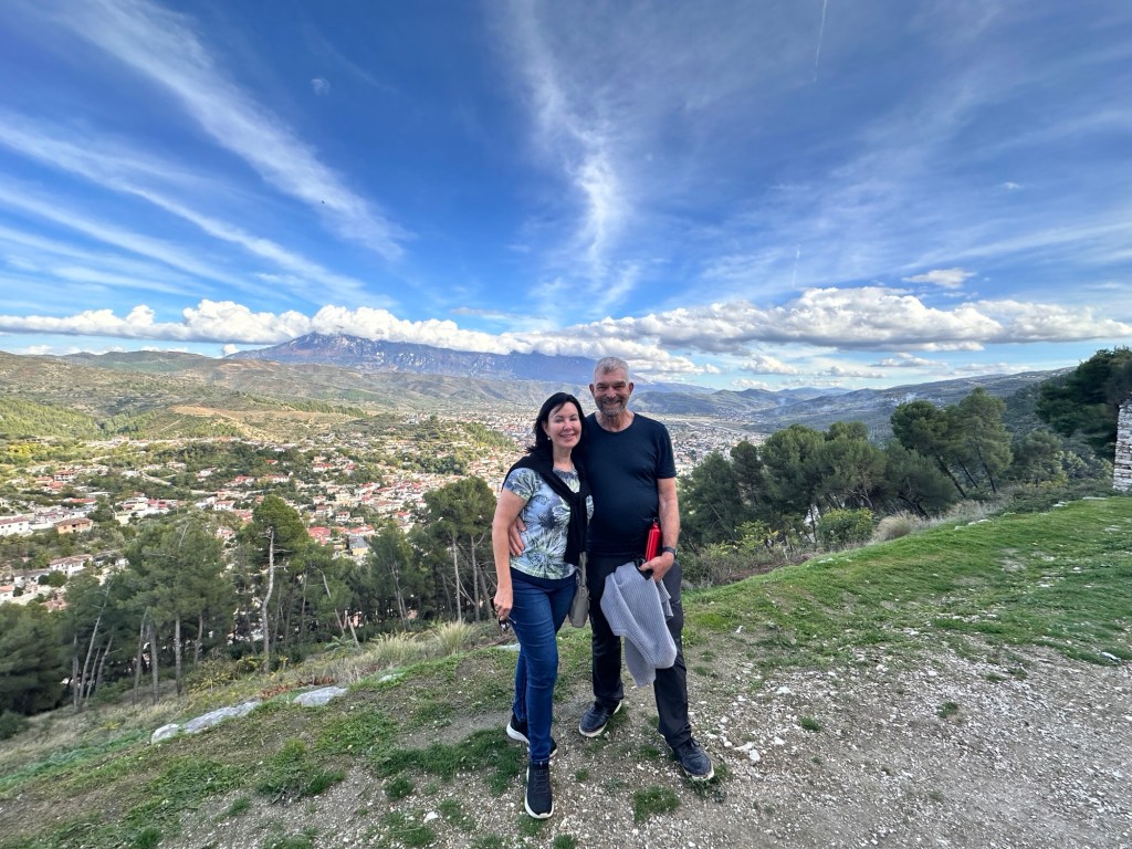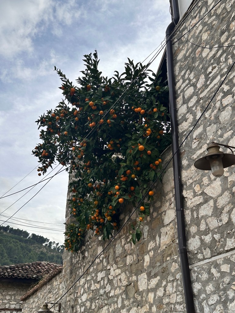 Travelling north through mountains and fertile valleys to Berat, we passed through thousands of olive trees – olive production is one of the main industries here. Picking season has just started. Orange, lemon, apple trees, are dotted everywhere, plus small crops of spinach, cabbage, and corn, also grape vines.