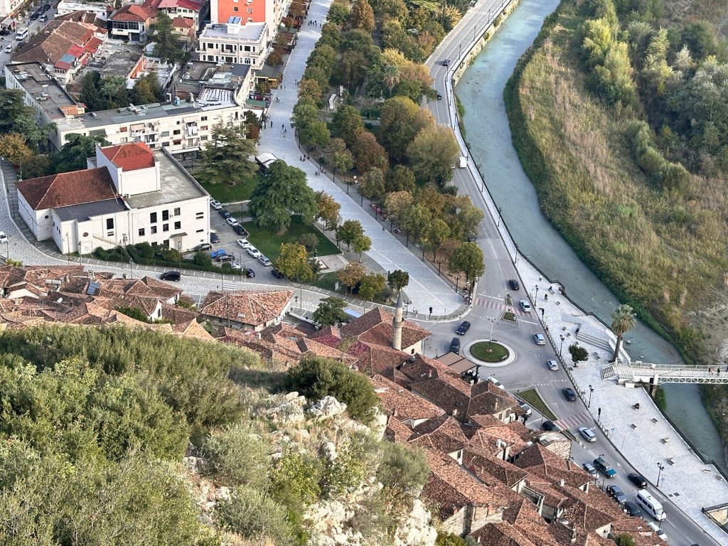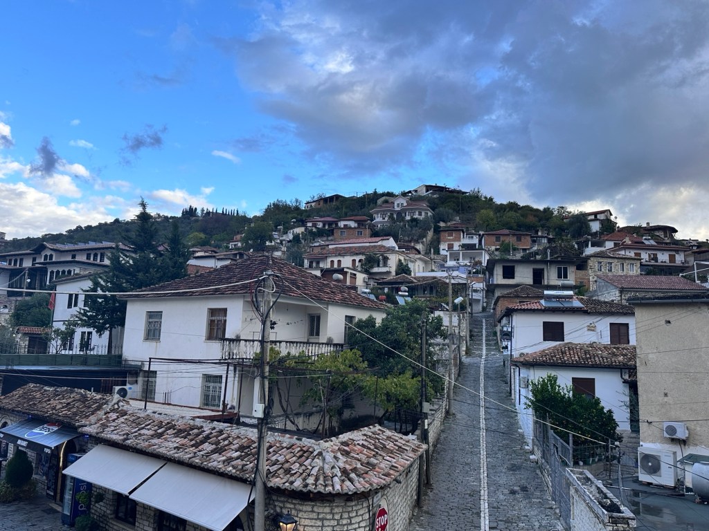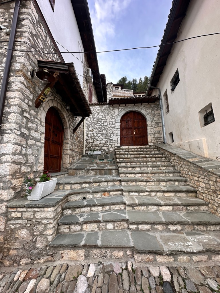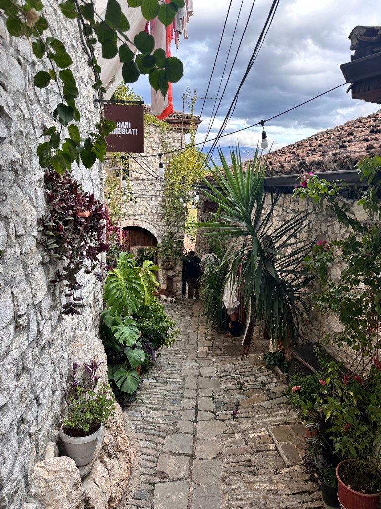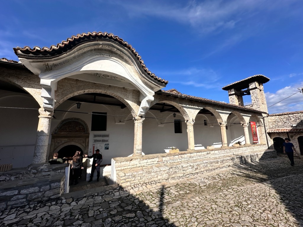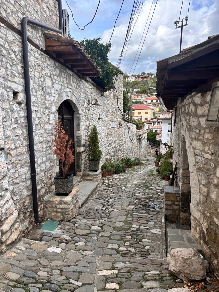 From here, we walked down a very very steep hill to Mangalemi, one of Berat’s historic quarters, located near the Osumi River. 15th Century Mangalemi was originally part of Berat’s Islamic old town; at the time, Christians historically lived across the river in the Gorica area. The houses here gave Berat the nickname “Town of 1000 Windows”. We walked along the cobblestoned lanes peering into the houses and shops – our knees and feet certainly knew about it by the end of the day!