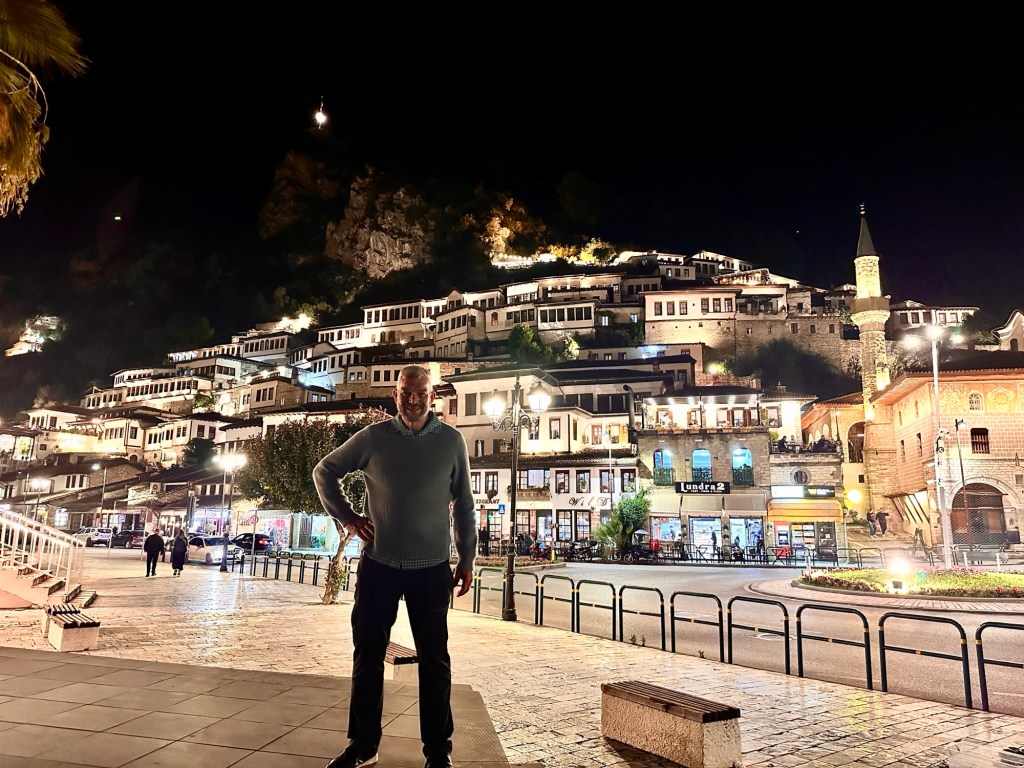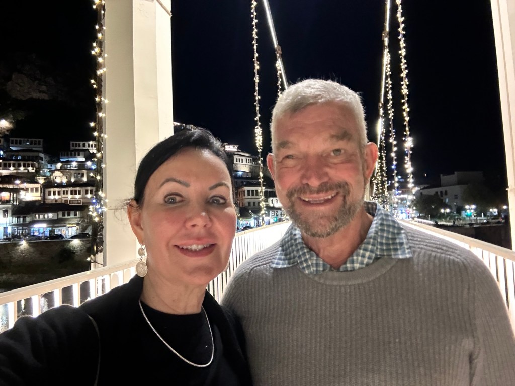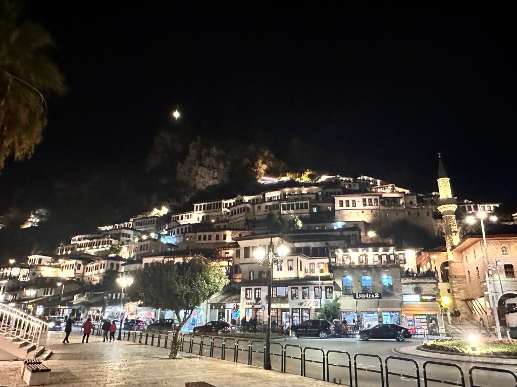 It was our farewell dinner tonight at a nearby typical Albanian restaurant. All local cuisine – eggplant stuffed with mince and tomatoes, rice filled peppers, spinach phylo slice, lamb meatballs, fresh Greek salad, a yummy cheese and tomato paste to go with fresh bread, and a dessert made with cream and halva. A walk around town to look at the lights was the perfect way to finish the evening.