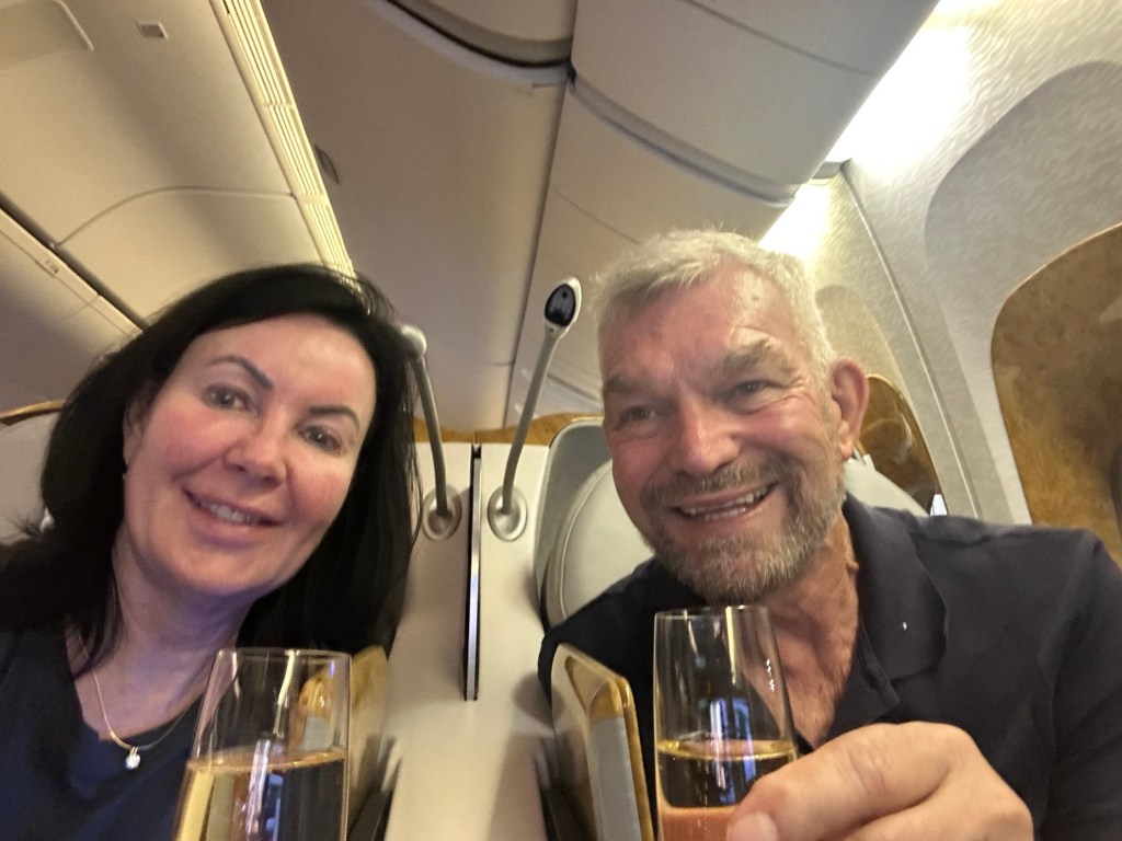Eventually, it was time for the first leg: a four-hour hop from Istanbul to Dubai, followed by a quick refresh in the Dubai lounge before the big one—a 14-hour flight home to Brisbane. I’ll admit, we were a little disappointed to see it was a B777 rather than the A380, but once the Veuve Clicquot started flowing, accompanied by five-star dining and rich French red wine, all was forgiven. Fine dining in the sky never loses its magic!