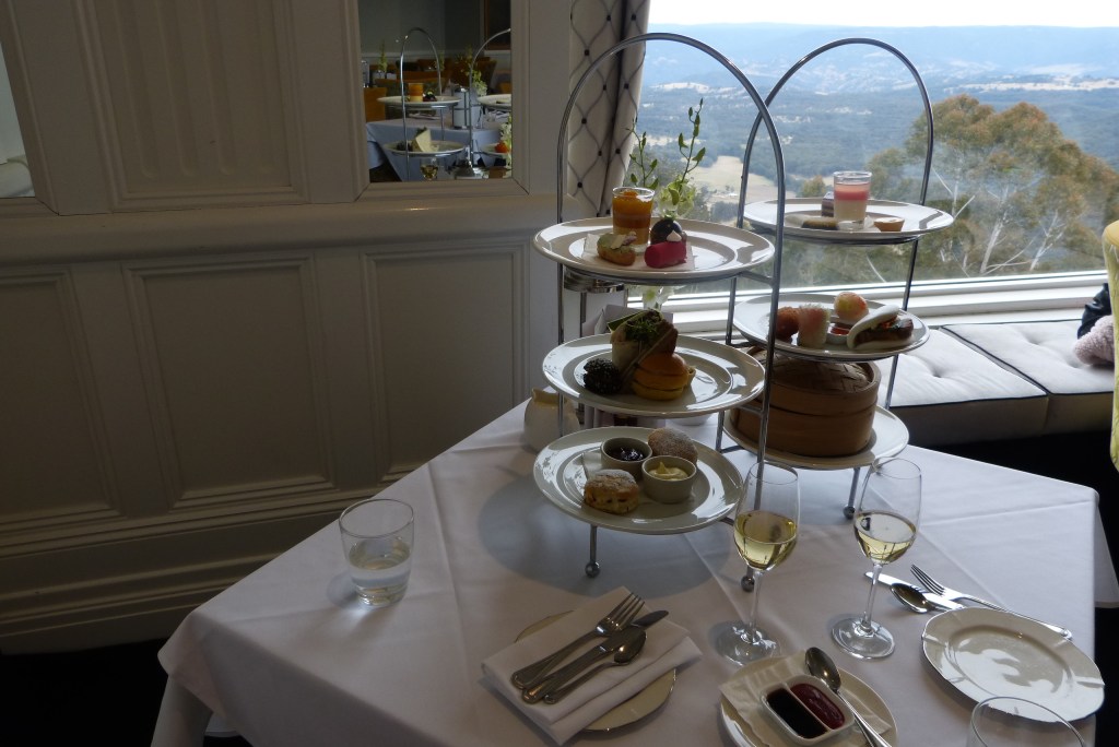 When in the Blue Mountains, a visit to the Hydro Majestic Hotel complex is a must. We drove the 5kms from Katoomba to Medlow Bath to enjoy our pre-booked High Tea. We ordered one of each of the Wintergarden and Eastern High Teas to share. Coupled these with a glass of bubbly. The scenery from our windowside table was magnificent!