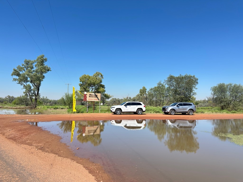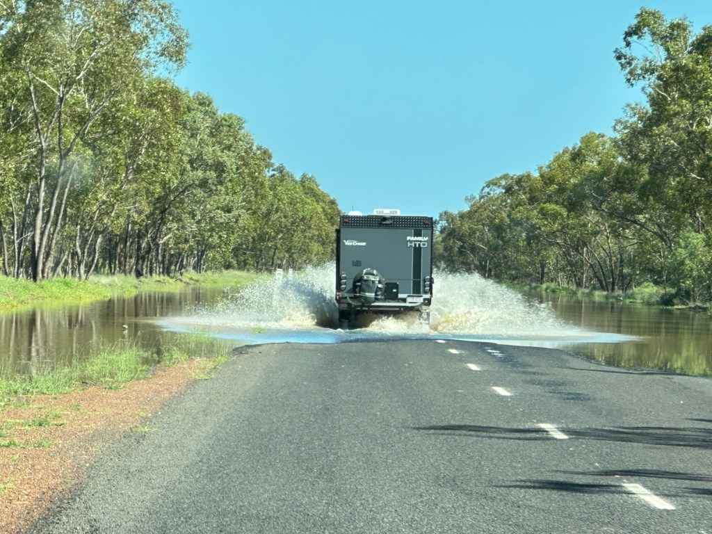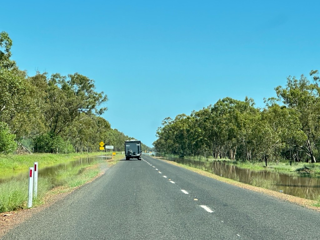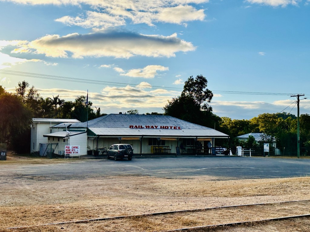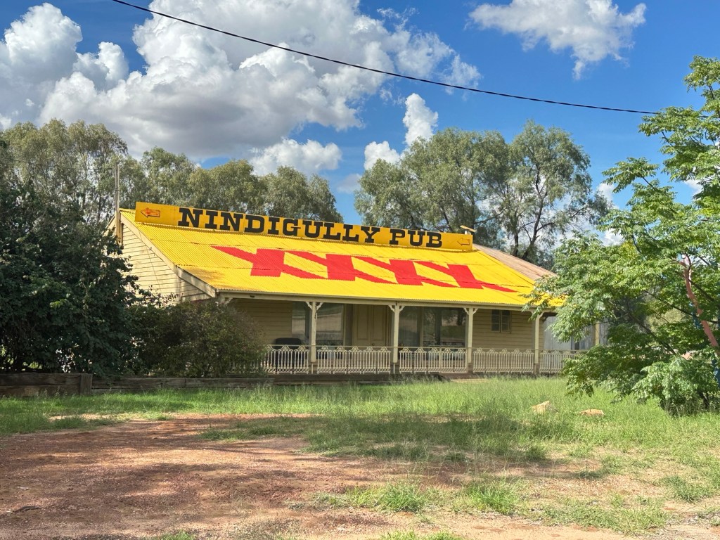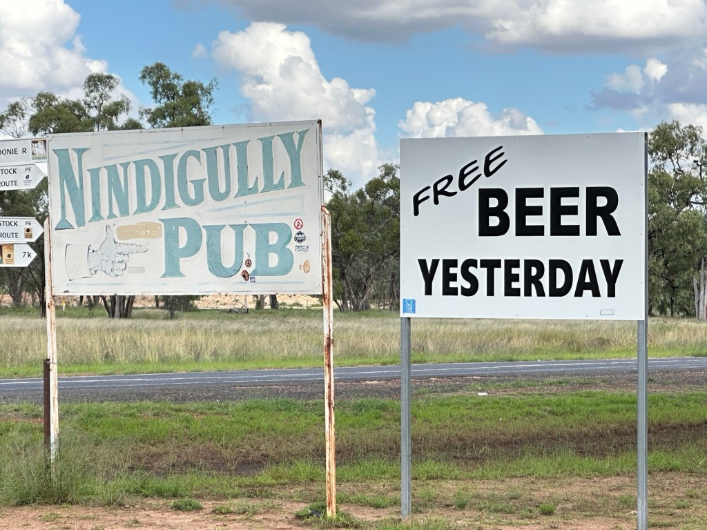 Another 40 kms to Nundigully. We were having a second attempt at Nindigully Pub. We had stayed here on Boxing Day 2023 – but it was closed. It only closes two days a year, and we had picked one of them! It was quite muddy this time so everyone was parked on the upper level near the pub…. and so did we! We weren’t risking getting bogged!