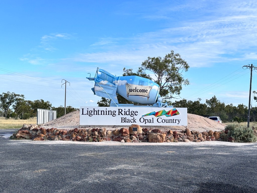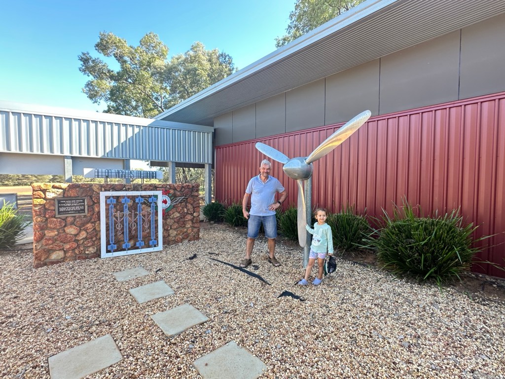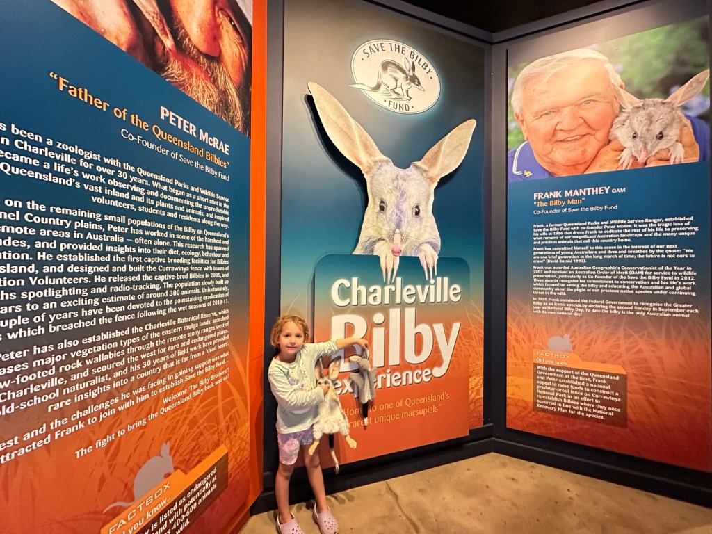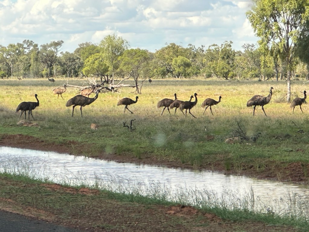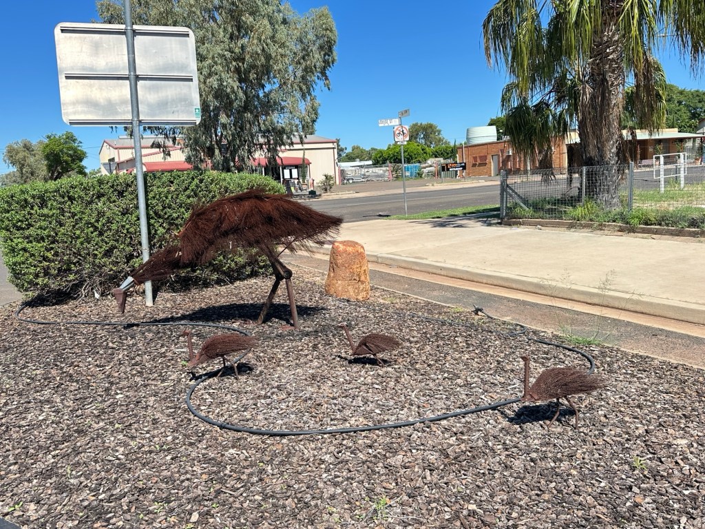 45 minutes onto Thallon, where we had to drive through quite a bit of water across the road. Once in Thallon of course we had to stop and check out the giant Northern Hairy-Nosed Wombat statue located at the park. Isla enjoyed climbing onto the wombat’s back. These wombats were almost extinct in Queensland but thanks to a conservation programme numbers are increasing.