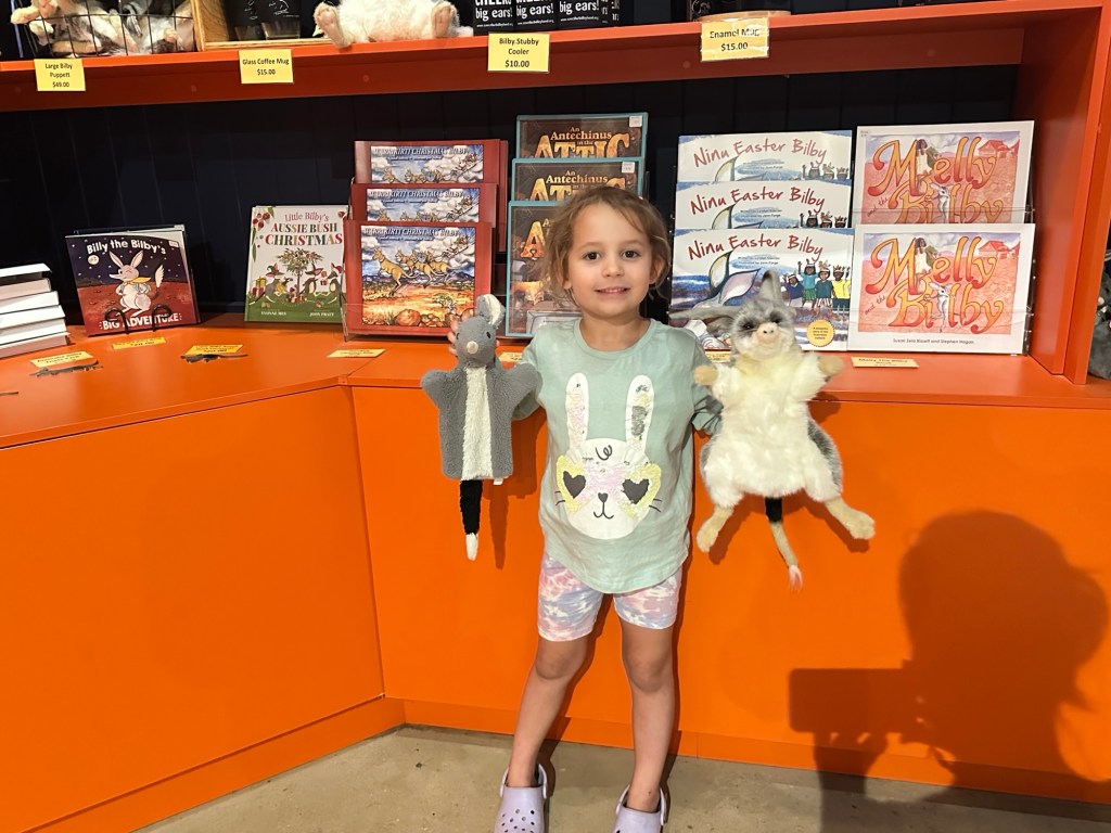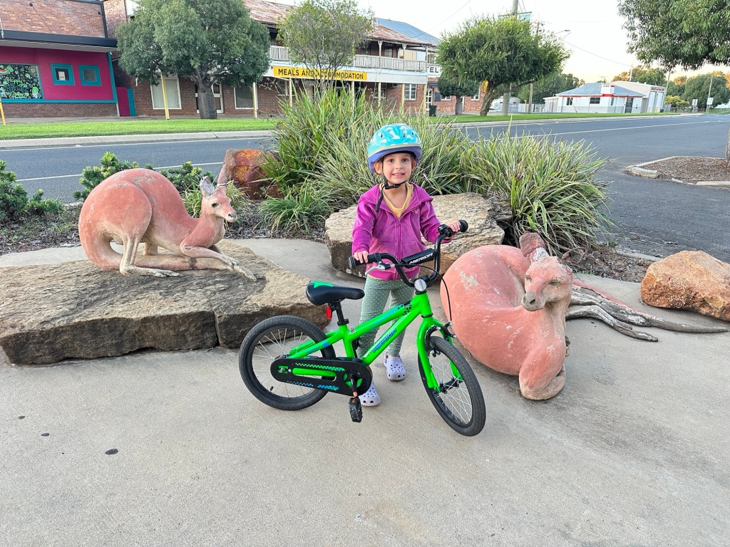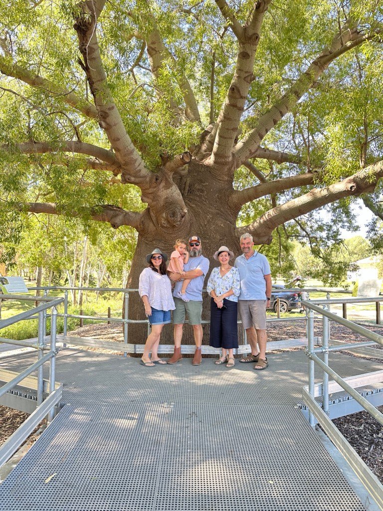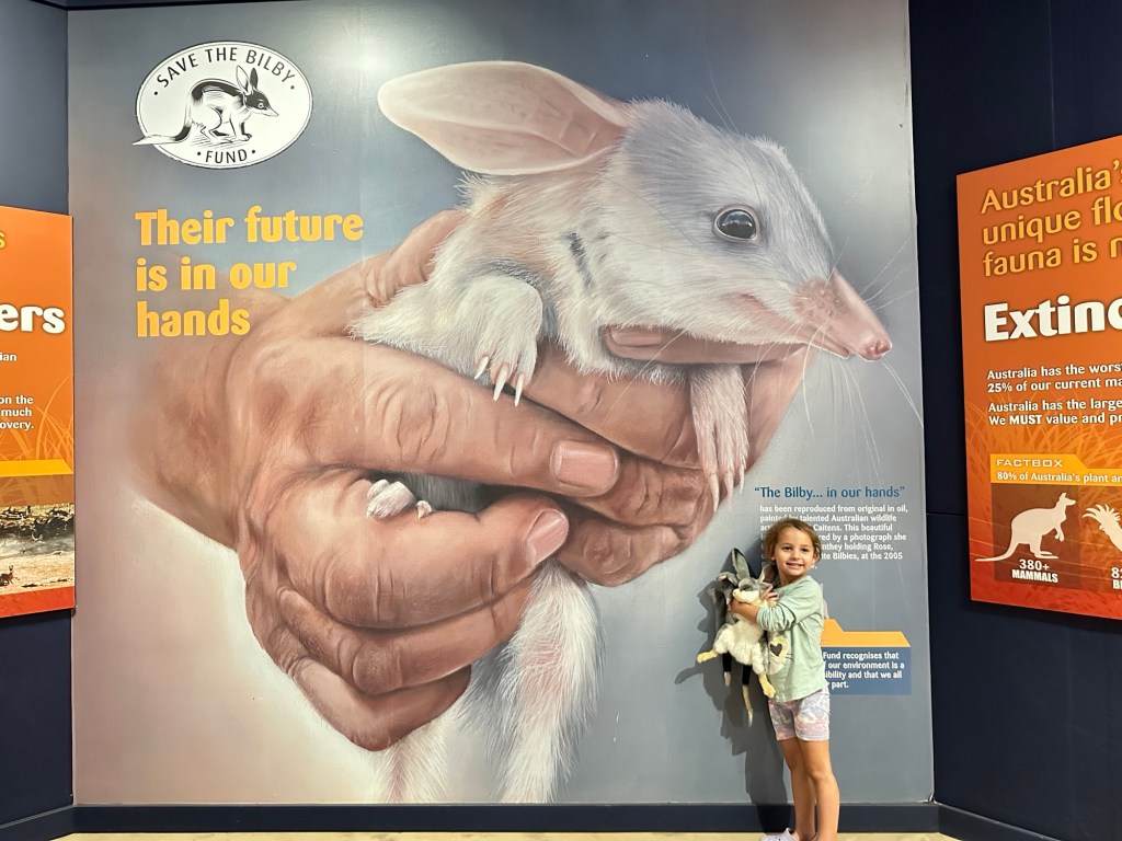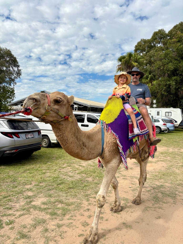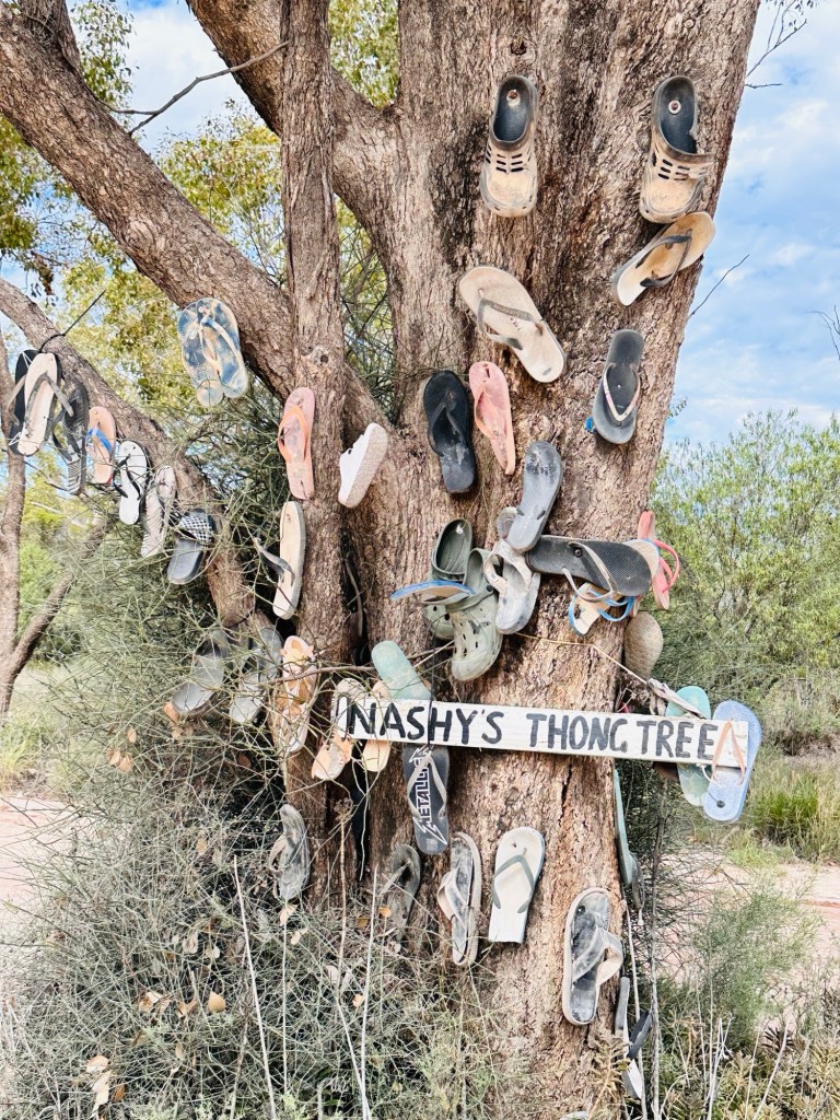 45 minutes onto Thallon, where we had to drive through quite a bit of water across the road. Once in Thallon of course we had to stop and check out the giant Northern Hairy-Nosed Wombat statue located at the park. Isla enjoyed climbing onto the wombat’s back. These wombats were almost extinct in Queensland but thanks to a conservation programme numbers are increasing.