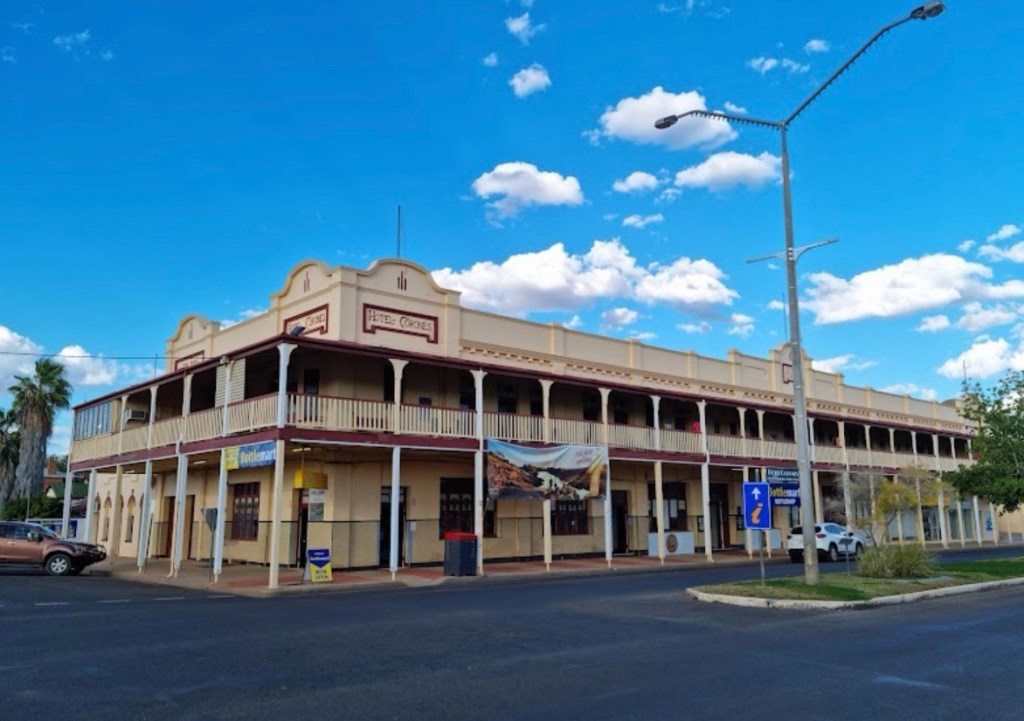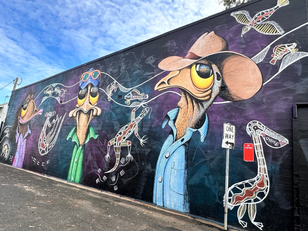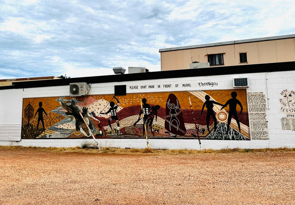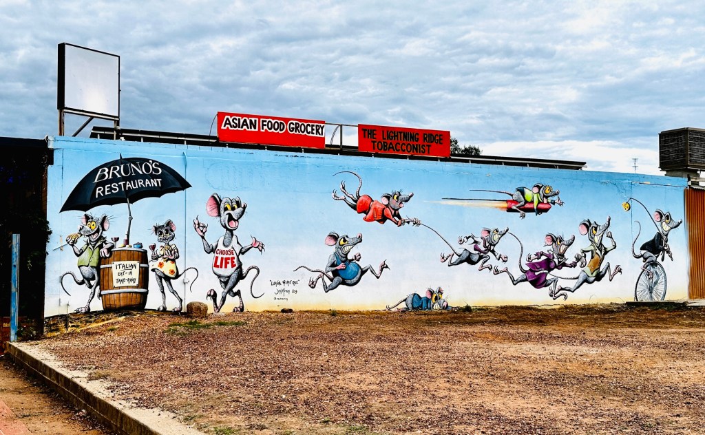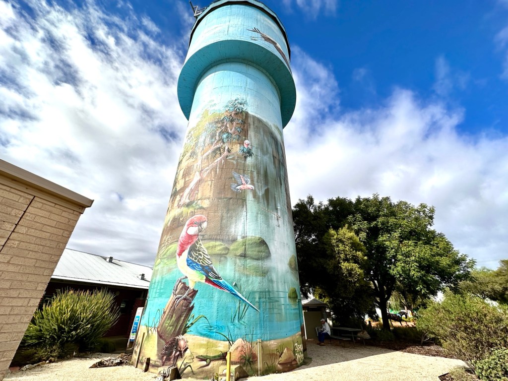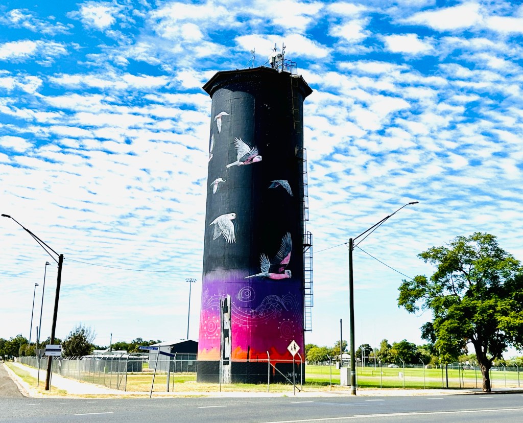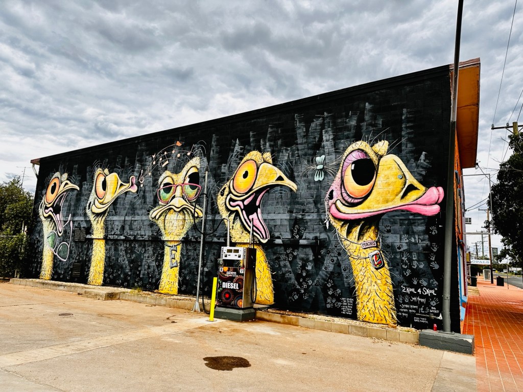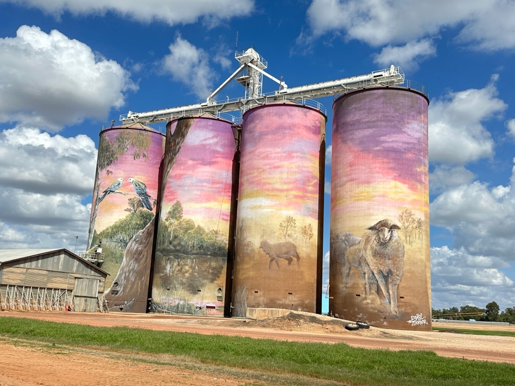 The other attraction in Thallon is the vibrant GrainCorp Silo art. The Watering Hole Mural covers four, 30-metre-high silos featuring icons of the district including the Moonie River, a beautiful sunset, a scarred tree recognising Thallon’s Indigenous community, pale-faced rosellas and a mob of sheep which celebrates the area’s agriculture. Very impressive.