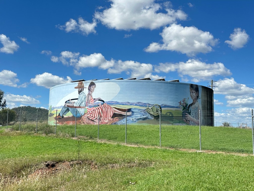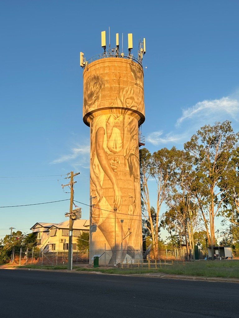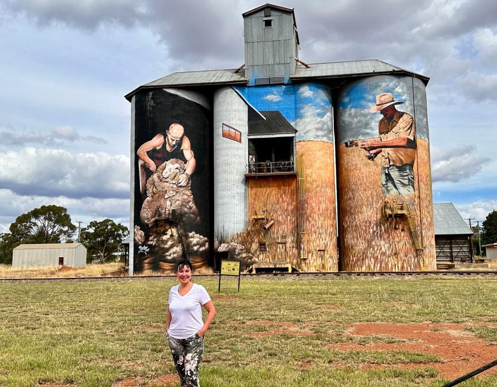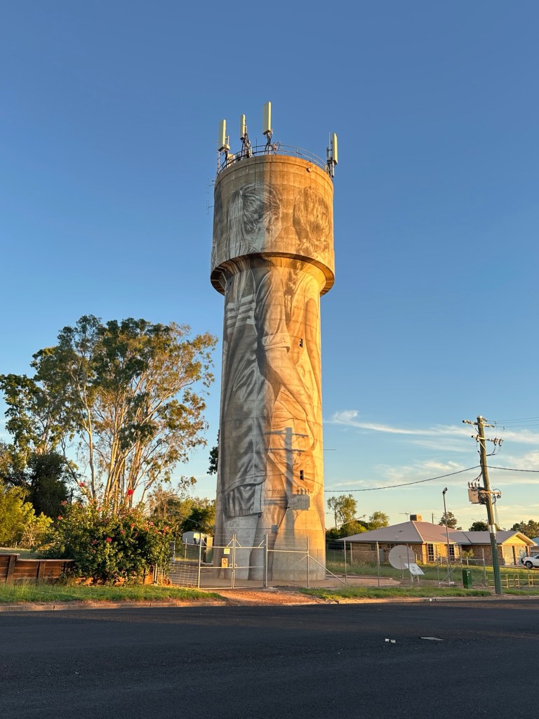 300 metres down the road were the famous painted Yelarbon silos – we walked down to get a closer look. One of the biggest silo artworks in Australia ‘When the Rain Comes’ conveys a sense of optimism and hope for the future while taking cues from the rich history of the community. The young boy sets paper boats afloat on the Yelarbon Lagoon, symbolising the ingenuity and craftsmanship of the town’s industries, past and present, that have carved out this oasis on the edge of the Spinifex Desert.