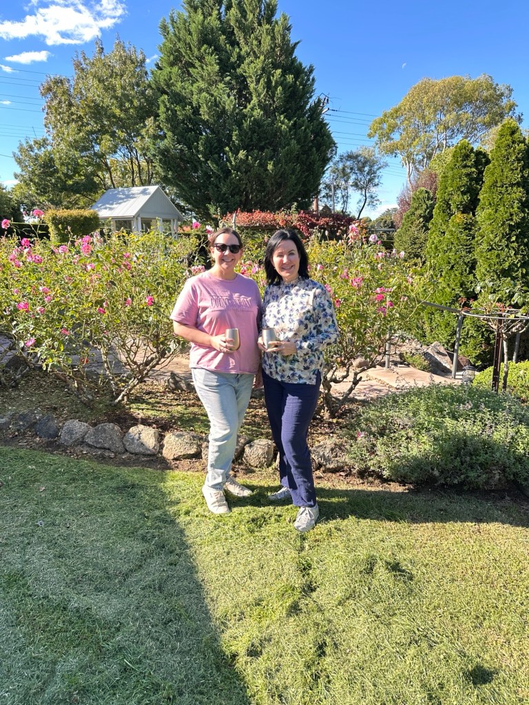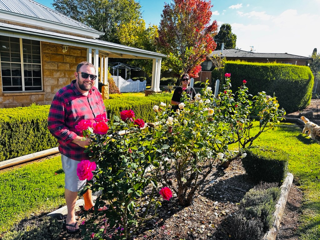 Travis and Louise arrived soon after – they had decided to bring their new caravan down for its first shake down. We had a lovely afternoon chatting and exploring the vast gardens of where we were staying. The roses and camellias were gorgeous, and so fragrant. Peter hosts open gardens here a couple of times a year.