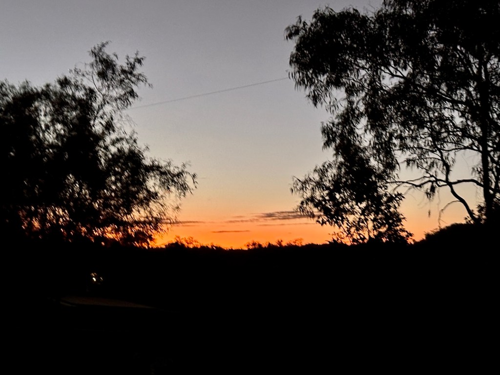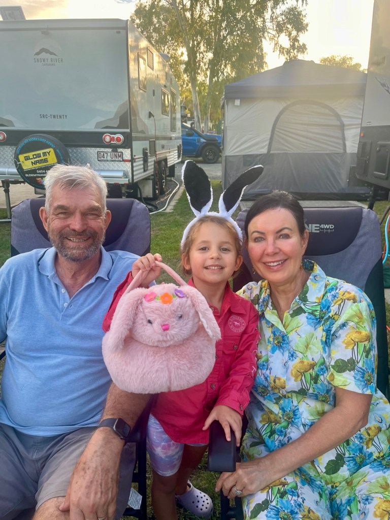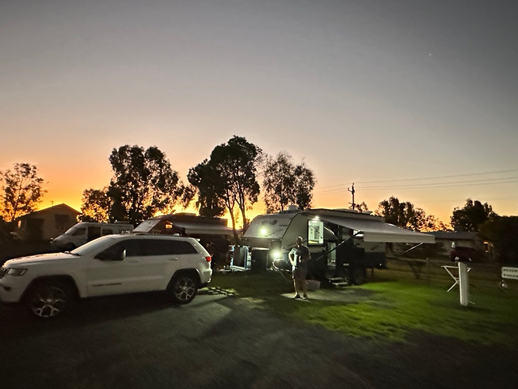We settled in, right next to the chicken coop and fenced vegetable garden. Chantelle, Simon and Isla arrived just after nightfall. They been delayed as they had discovered an “issue” with their power inlet point just as they were about to leave home. A stopover to see Jason at Condamine Caravan Repairs on their way soon sorted them out. Jason is getting good business from our family.