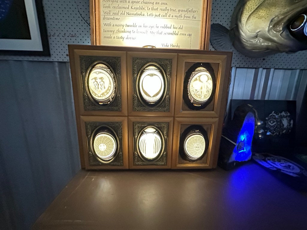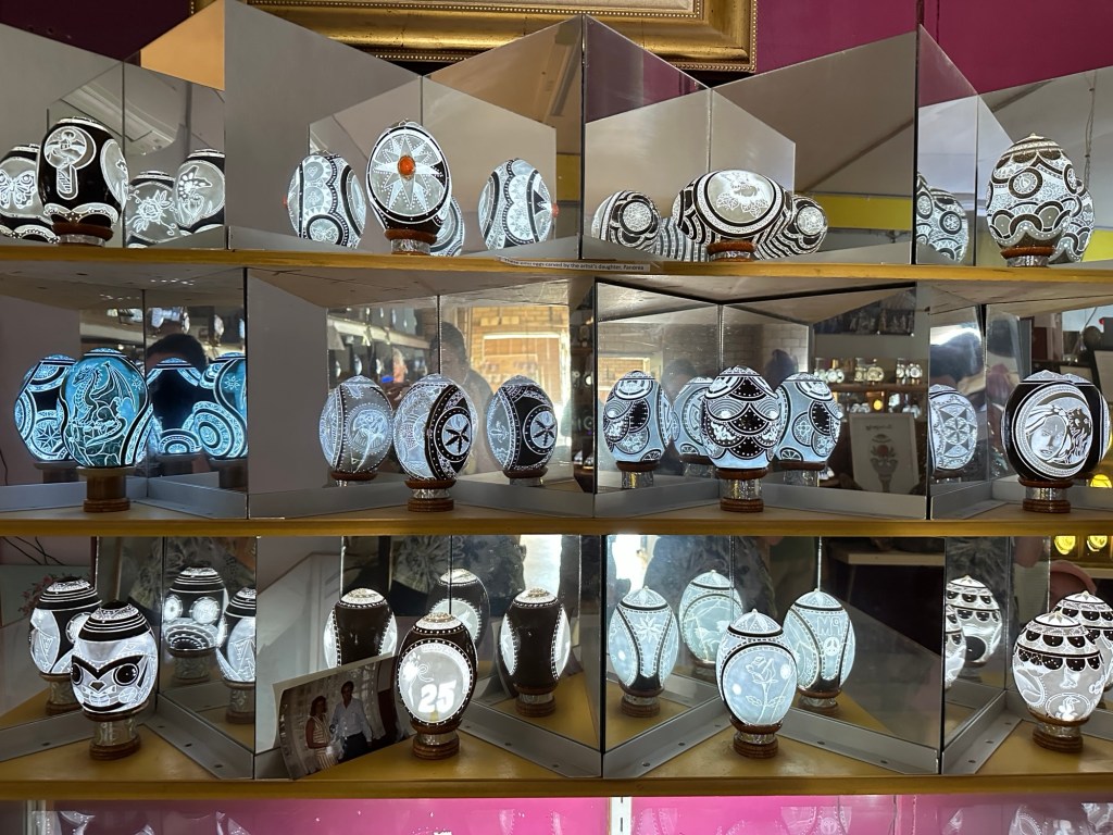 Today we explored St George starting with a visit to Unique Eggs. For over 40 years, local legend Stavros, transformed humble emu eggs into intricate, glowing masterpieces, carving breathtaking patterns and scenes that have dazzled visitors at World Expos and even found their way to the White House. Emu eggs have 10 layers of shell, the tenth being nearly white. Once the design has been carved into the shell, it is illuminated and the masterpiece is complete -approximately 80 hours of work.