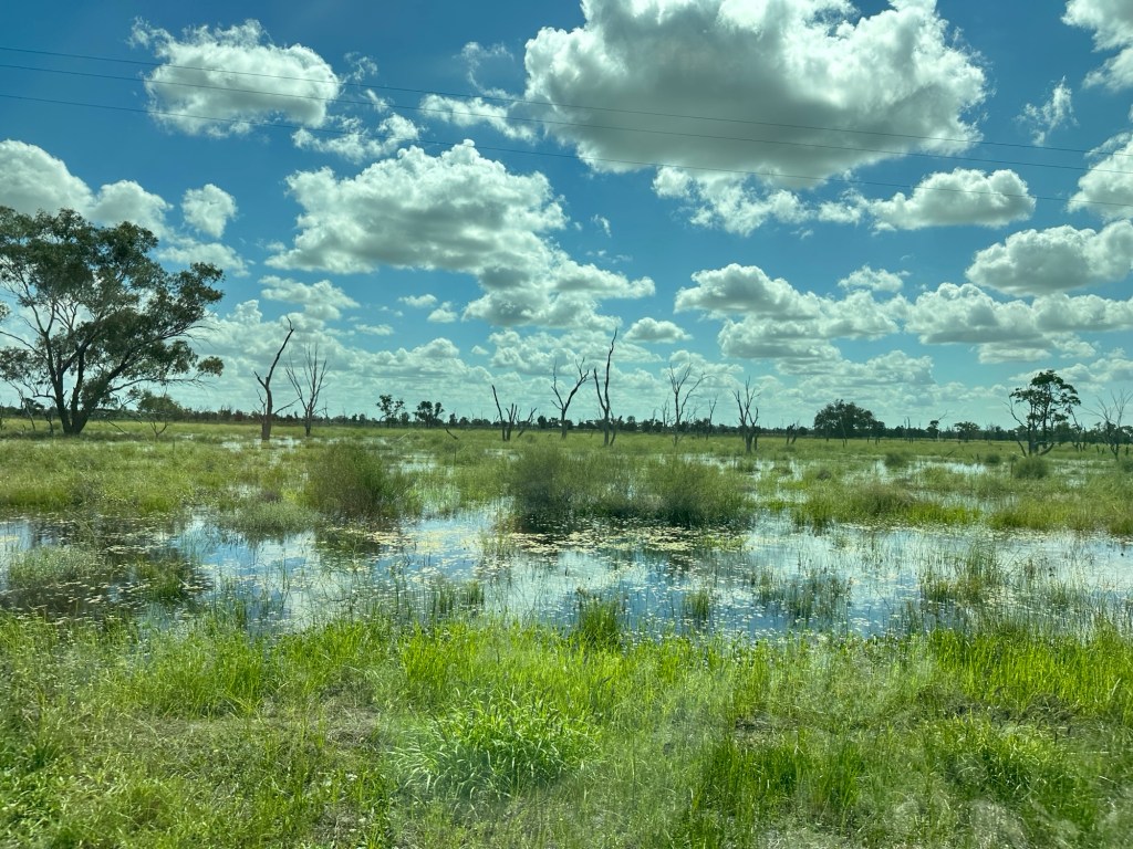 Packed up with no fuss, and onto Cunnamulla. Another stunningly green drive – it was green right up to the road’s edge. A long straight toad, and surprisingly good, although narrow. We stopped at Bollen hoping to get a coffee, but the cafe had closed since our visit twelve months ago, and the hotel had burnt down six weeks ago.