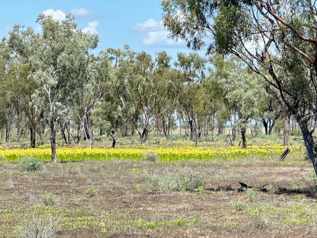 So onwards and forwards to Cunnamulla- quite a bit of water over the road in parts, up to 300 mls at times. Pretty of yellow lily wildflowers in the paddocks. Bird life in abundance – eagles, brolgas, and lots of emus. Also many lizards sunning themselves on the road.Some livestock, all looking very healthy.