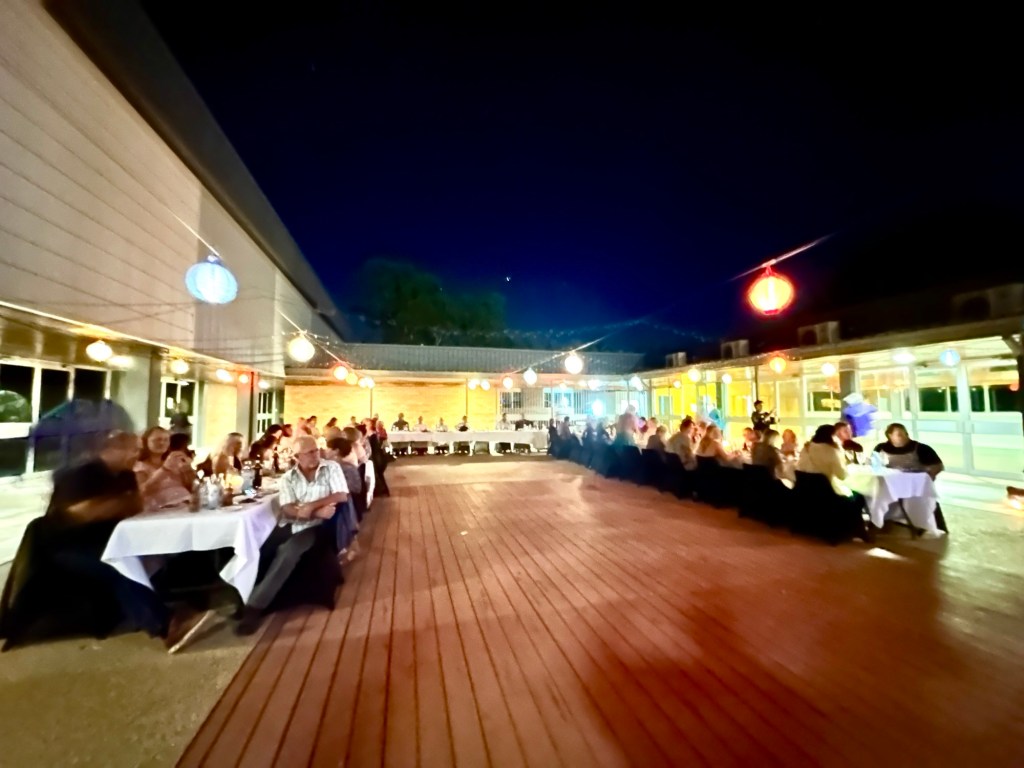 We felt we had “done” town so we went back to our caravans and had a restful afternoon. Frank and I then got ourselves dolled up to go to the Long Table Dinner marking the opening of the Outback River Lights Festival. The taxi driver, Rick ( who is also the Deputy Mayor plus the Bowls Club President) took us into town for this inaugural event for 120 guests.