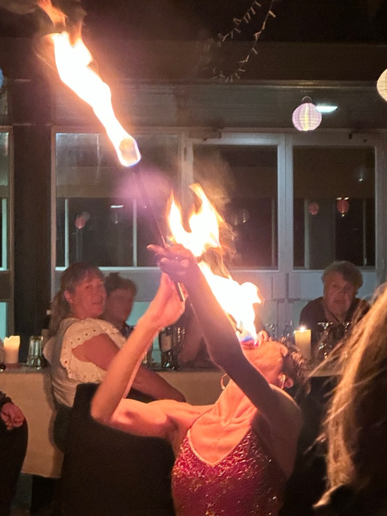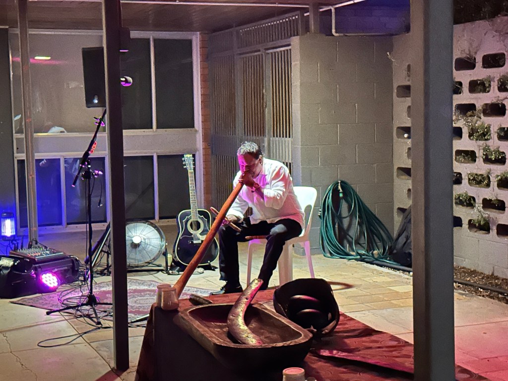 The entertainment included local didgeridoo player Tommy Crow, circus flame throwers, and a great singer/guitarist. Great night, and Rick came back to take us home to Riverside.
