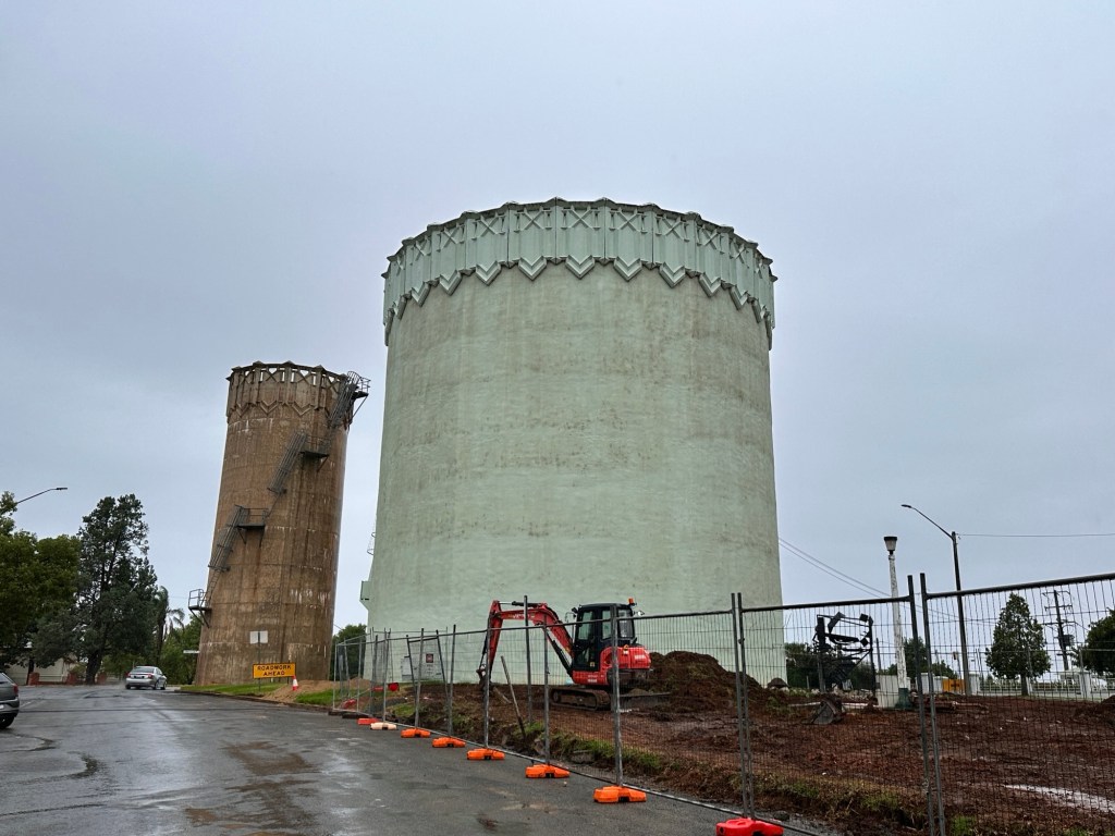 Nearby, we stopped to view the artwork on the water tower. The mural was painted in 2019 by Guido Van Helten. The image represents the children and the future of the community.