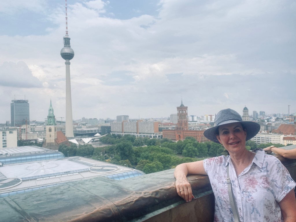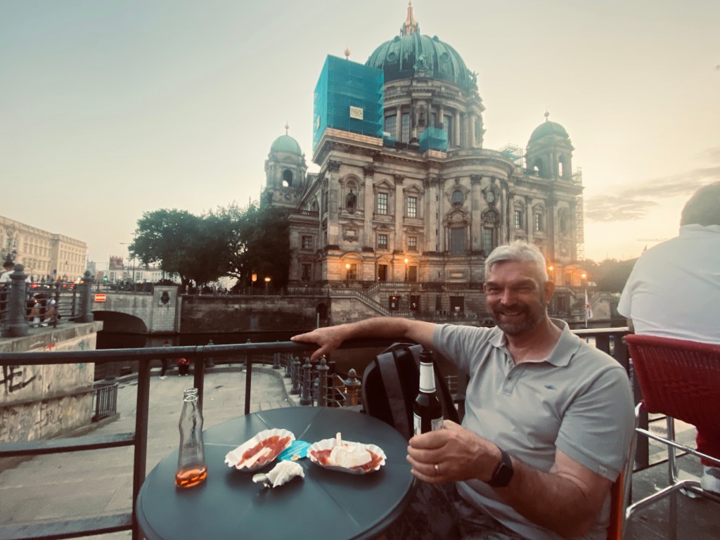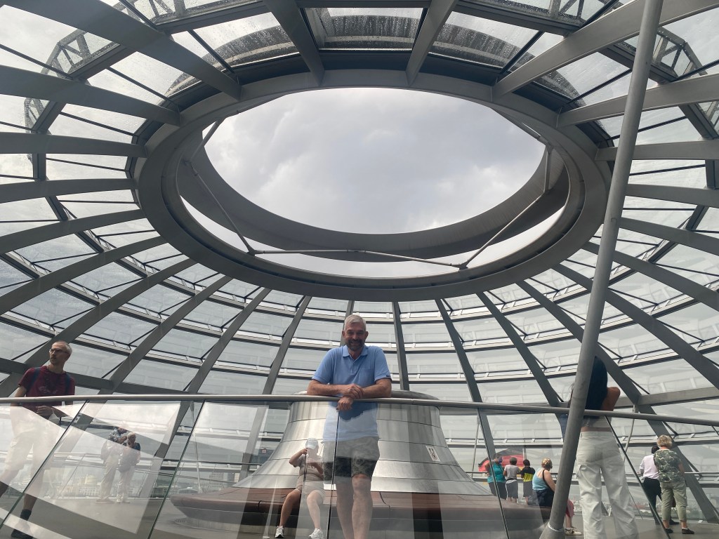 We then walked back to the Berliner Cathedral – to climb the 267 stairs up to the viewing platform at the top. It was hot going , in the heat, but worth the 360 degrees view. Berlin is very flat, and landmarks easy to pick out. Once back down, we bought a beer at the church cafe ( as you do), which is right on the bank of the river – the cool breeze coming off the river was sensational! Then the rain came, and the temperature dropped immediately… instant relief!