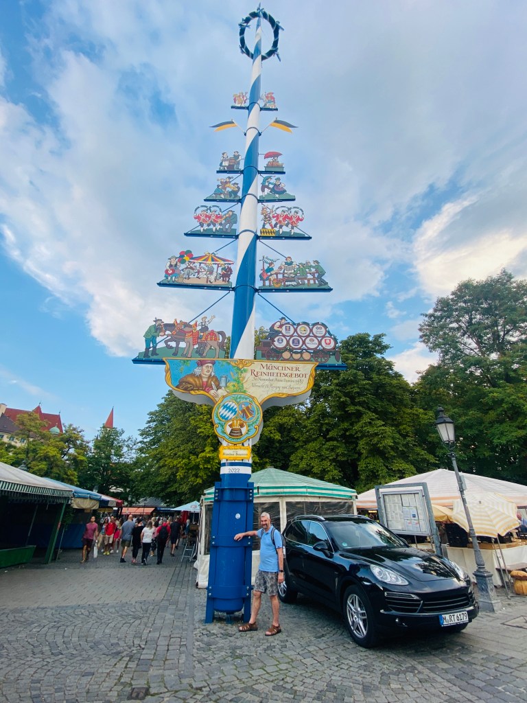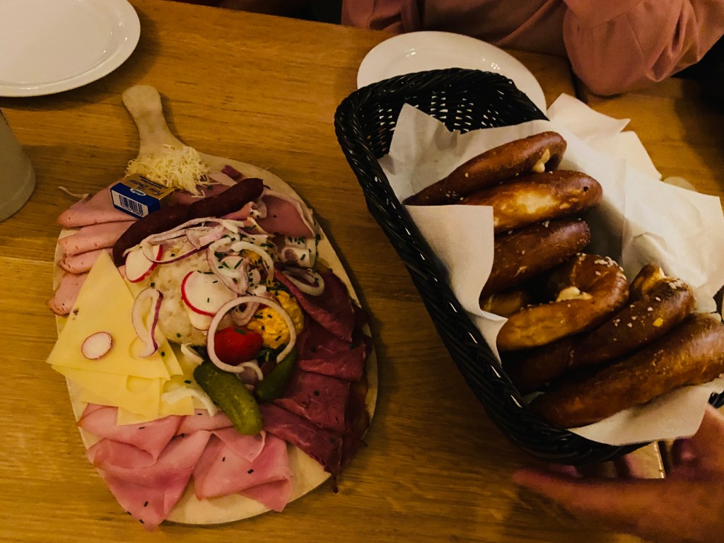 Checked in, then out to find the meeting point for the Beer and Bavarian food tour we were booked in for. It was fabulous! We had a leisurely walk around Munich’s medieval squares – Karlsplatz and Marienplatz – drinking a beer as we went… which is the norm in Munich! Saw the old and new Town Halls in Marienplatz. We walked through the Viktuallienmarkt which is Munich’s main market – the beer gardens here are the only Beer garden which serve beer from all the city’s brewery. Also saw maypoles, and dirndl and lederhosen stores- our guide gave us a lovely overview of life in Munich.