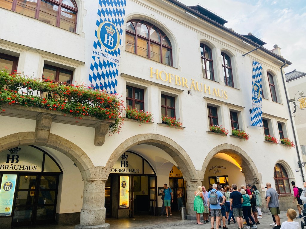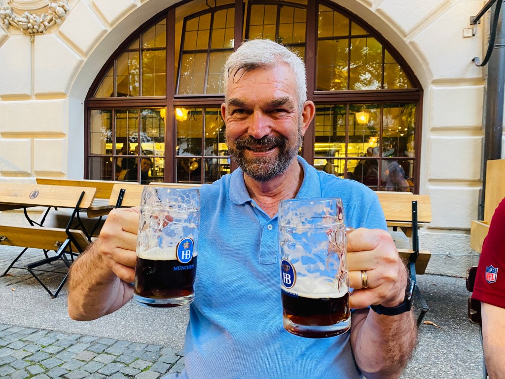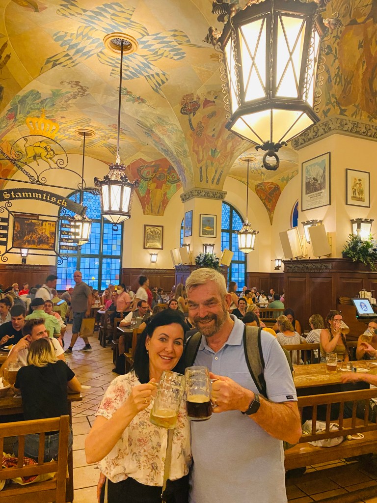 Next, the Hofbrauhaus- the most popular beer hall in Munich. It was first established as a court brewery in 1589. The Schwemme on the ground floor, is a large hall with frescoed ceiling and houses up to 1000 visitors. Our guide gave us an extensive history of beer, types of beer, and samples of beer. There are 6, soon to be a seventh Munich brewer, and 5 types of beers. The Helles is the most popular, and my favourite- very refreshing. Frank was keen on the Dunkel beer, which is a dark beer( from dark amber to red-brown in colour). There is also the Eisbock, Weissbier ( wheat), and Malbock. So much atmosphere in the Hofbrauhaus with a live oompha band providing some entertaining music. Huge pretzels were being sold like hot chips. You can have your very own mug put into a locked cage, but you need to jump through a lot of hoops to earn that privilege!