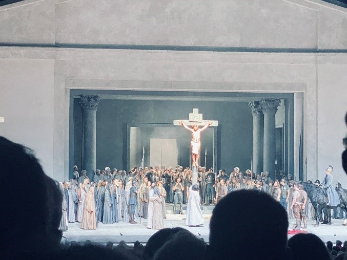 Had a bit of a change with the train timetable which we had to organise, all sorted without any trouble. So today was a train from Munich to Murnau, then bus from Murnau to Oberammergau. Oberammergau is a small town in Bavaria, which is famous for it folk art and passion play. Well we were here for the Passion Play, postponed from our planned 2020 trip. The plague of 1632 came close to wiping out the entire population of the village. It’s surviving inhabitants pledged that if they were saved , they would stage forevermore a play about Christ’s Passion. No further deaths occurred, and to this day the villagers have kept their pledge. Every ten years some 2500 people take part in the six hour long spectacle in which they transform themselves from Bavarians to Jews and Romans from the time of Christ. Apparently they start growing their hair from Ash Wednesday the year before the play. About 100 performances are staged between mid May and mud October in the Passionspielhaus.