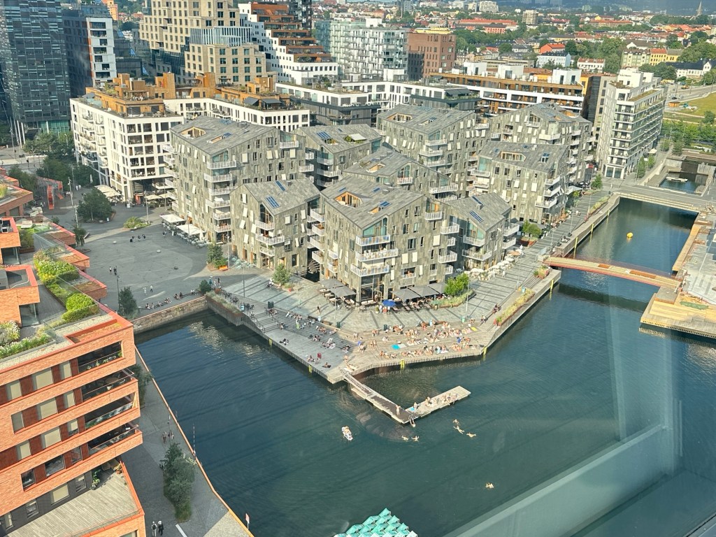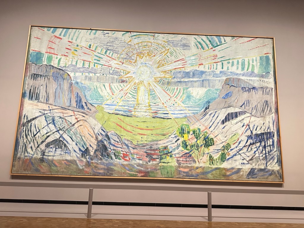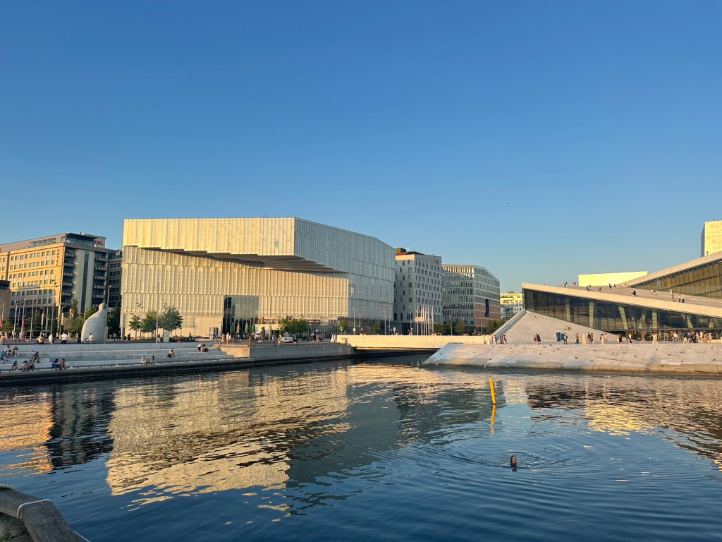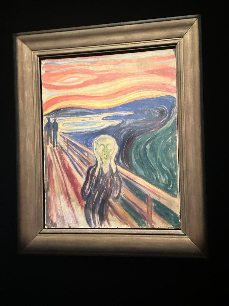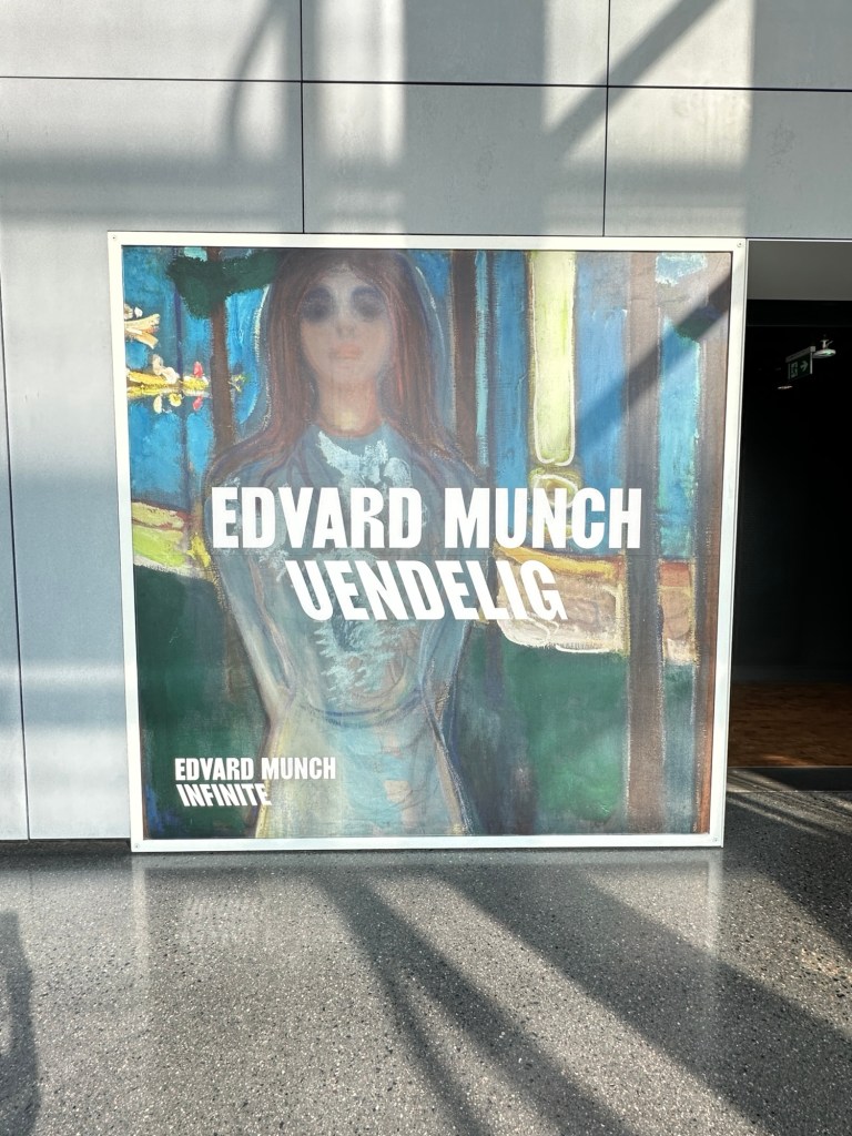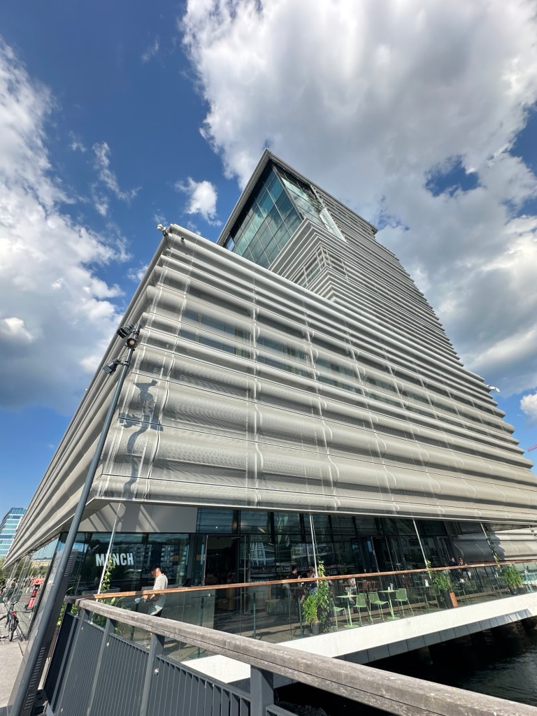 Across the waterway is the Munch Museum – dedicated to the life and works of renowned Norwegian artist Edvard Munch. Munch led a troubled life, plagued by melancholy and depression; this had a profound influence on his work, which remains a great cornerstone of early Expressionist art. Highly prolific, he left an amazing 1,100 paintings, 4,500 drawings, and 18,000 graphic works to the city of Oslo when he died.The very famous “Scream” has centre position, plus numerous other works. Great city views from the thirteenth floor, plus views of surrounding apartment blocks, and residents swimming and kayaking in the fiord. Great way to cool down on such a hot day.