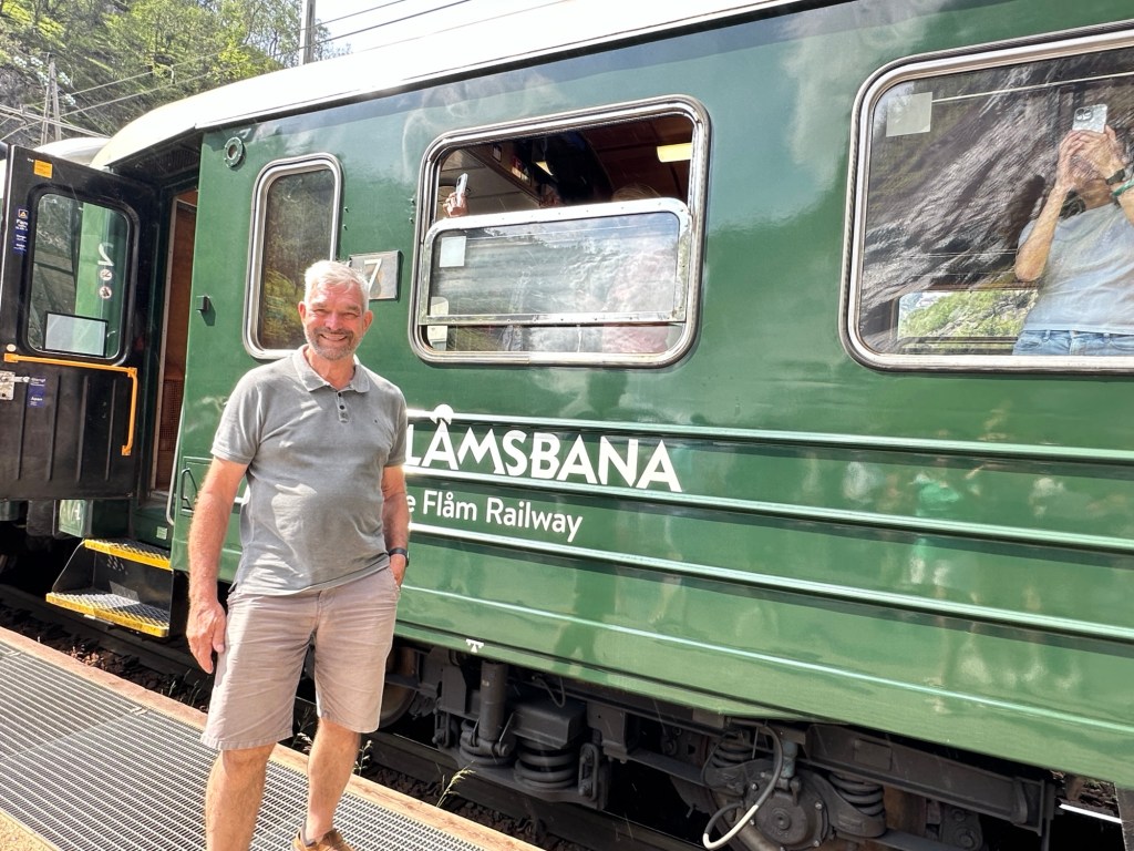 In Myrdal, we swapped trains to board the Flåm Railway for an incredible 20 kilometre ride with a 900 metre descent to the beautiful village of Flåm. The Flåm Railway is one of the steepest train journeys in the world, winding through some of the most dramatic fjord and mountain scenery in Norway. It has 20 tunnels – 18 of which were excavated by hand, and took around 20 years to build – from 1924 to 1944. Stunning scenery. There was one disappointment, in that you couldn’t hear the commentary.