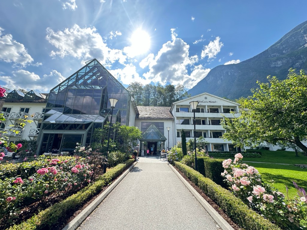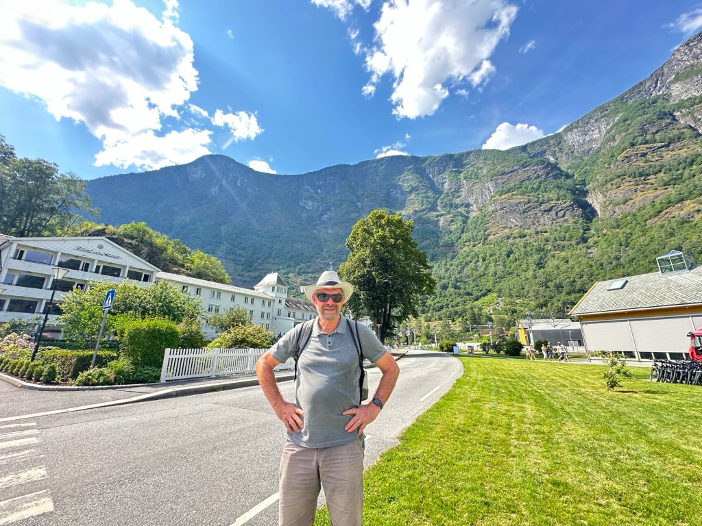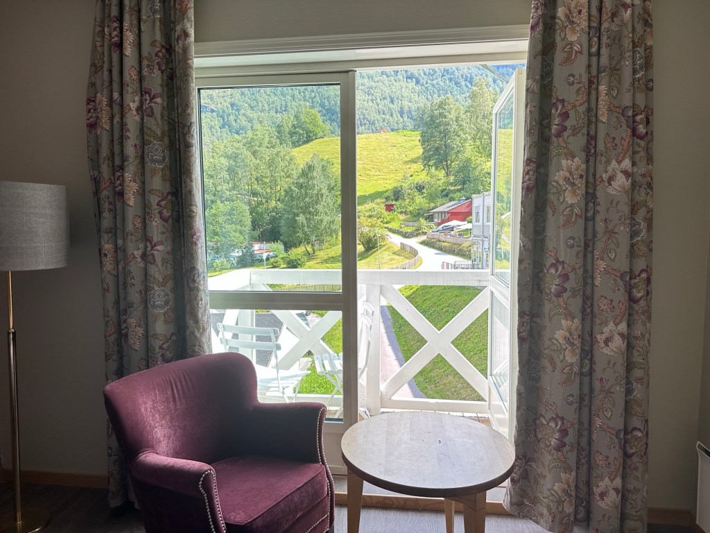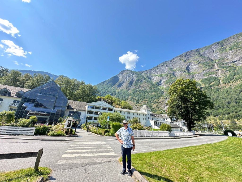 Once at Flam, we could check into the Fretheim Hotel – it was like a ski lodge (which is what it is in winter). The hotel is framed by a huge mountain behind it, quite spectacular.