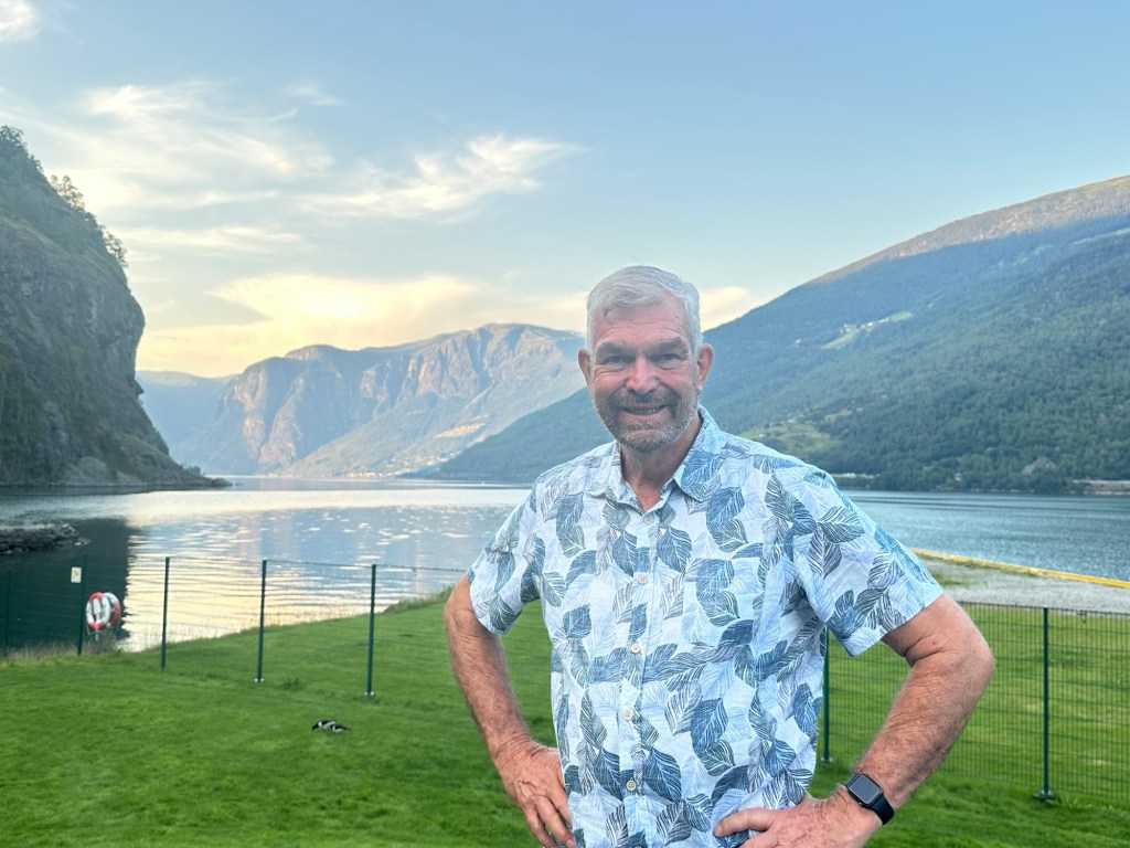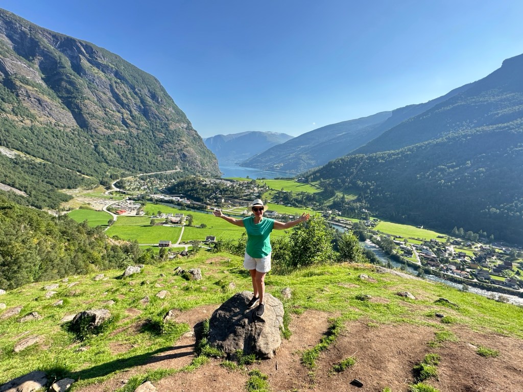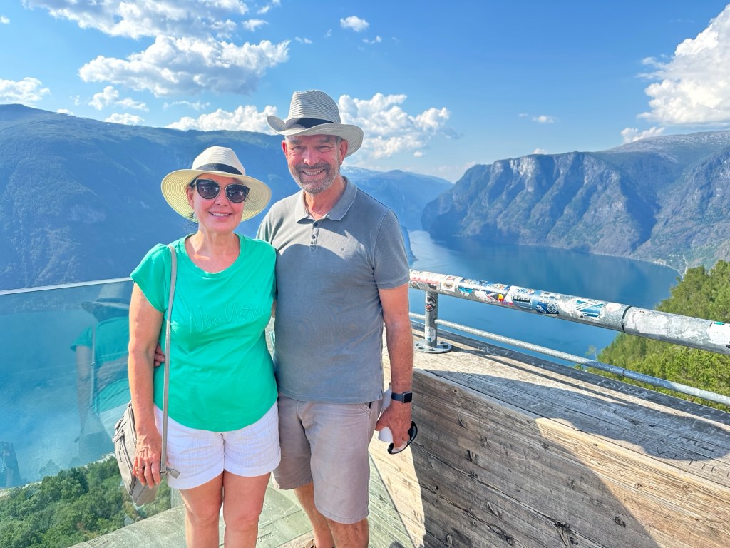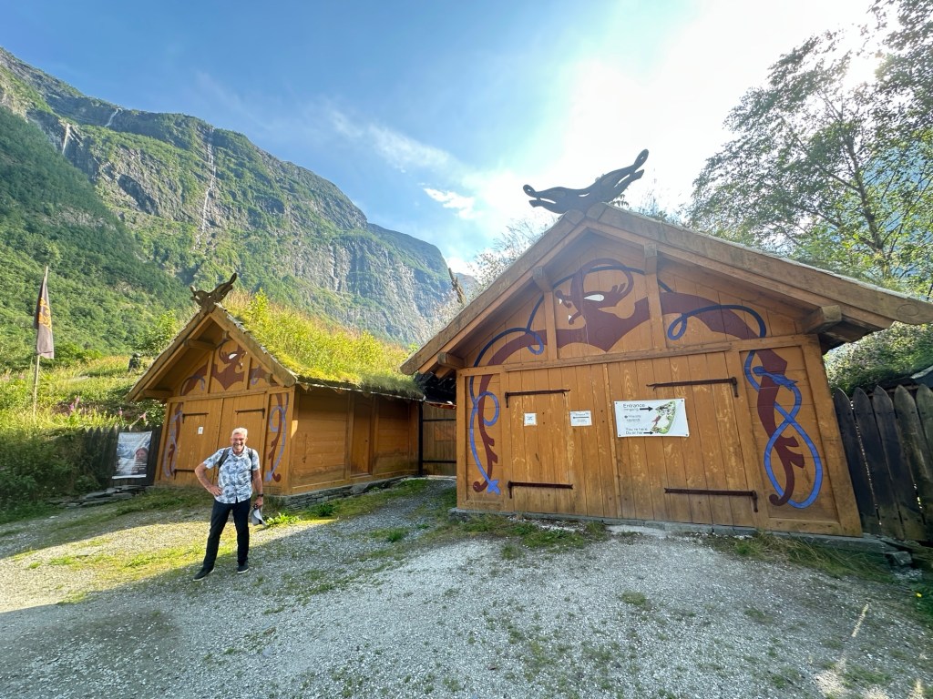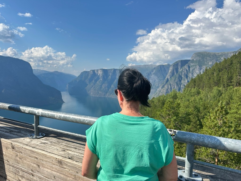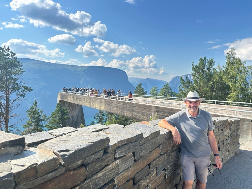 There is quite of optional activities to do in Flám. We had chosen to go to the Stegastein viewpoint. This involved a thirty minute bus tour on a very narrow winding road (I thought we were back in Scotland!) from Flám via Aurland, to the extraordinary and spectacular viewpoint. This structure, which juts 30 metres out from the mountainside, is located 650 metres above the fjord, offers an unparalleled panorama. A fantastic view of the fjord, mountains and surrounding landscape.