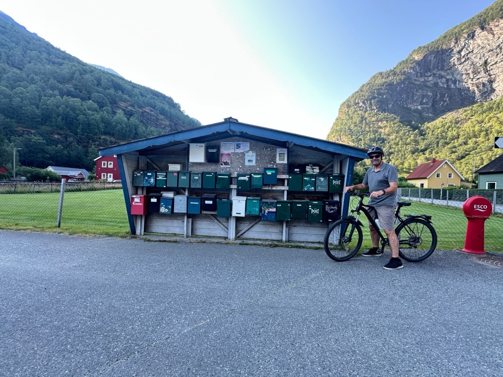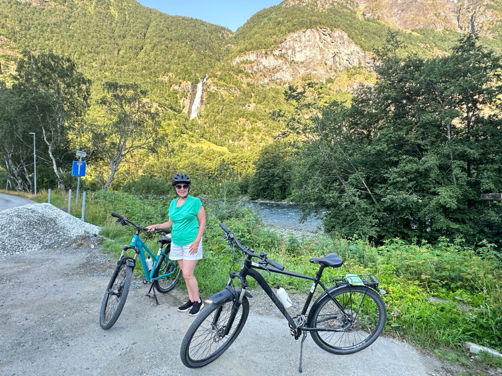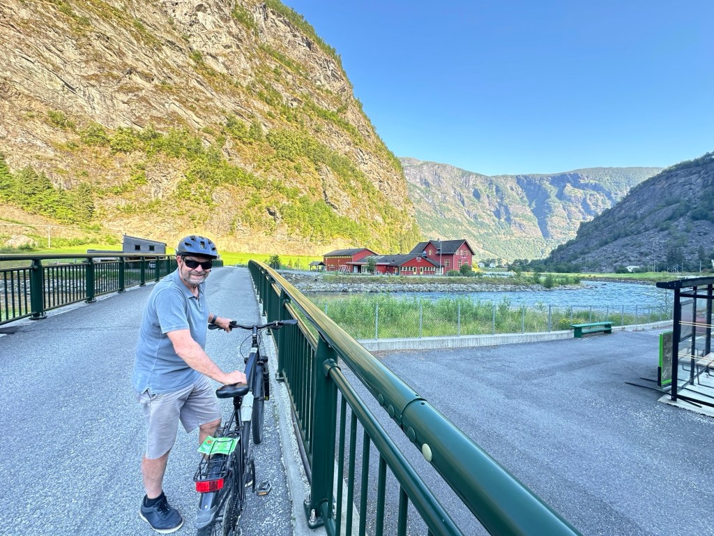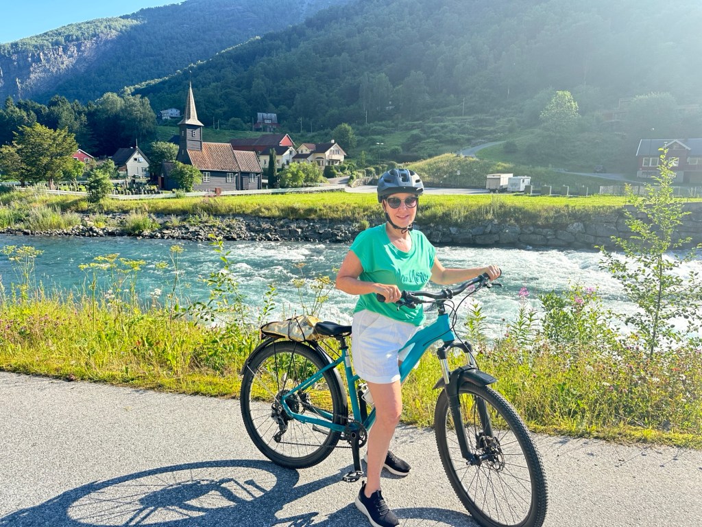 We had free time until 2.30pm. Our plan was to hire bikes and have an early bike ride after breakfast and before it got too hot. The ride to Lunden was very pretty- I love the little painted houses, some with grass growing on the roof. The Flám Church and graveyard were a pretty centrepiece of the village.