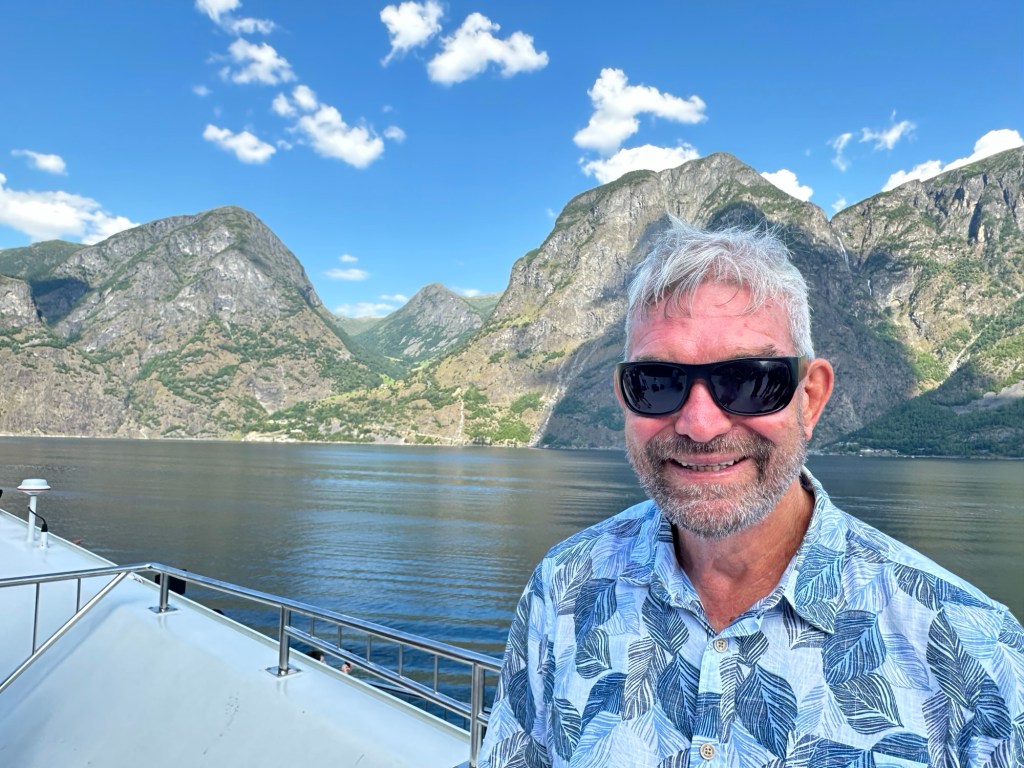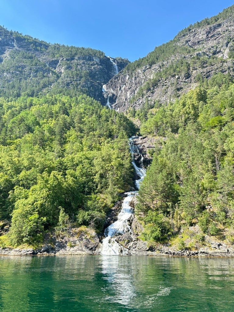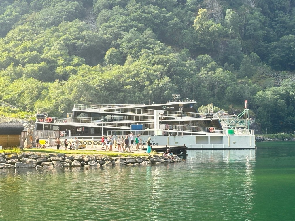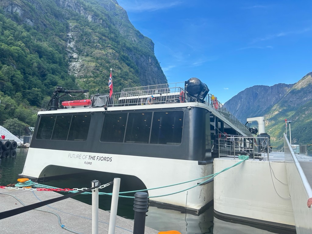 For the next two hours we went on an amazing electric catamaran through Aurlandsfjord, and the World Heritage-protected Nærøyfjord, the narrowest fjord in the world. This arm of the Sognefjord, with its tall mountains, mighty waterfalls and small farms clinging to the steep mountainsides, was just stunning. Of note, it only takes 25 minutes to charge the 400 person capacity boat.