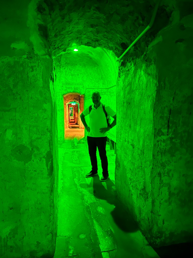 We had two and a half hours transversing the tourist route through the mine, first walking down 40 flights of steps to 65 metres below the ground, eventually going down to 135 metres. Fortunately there was a double story four cage lift to take us back up to the surface. There are 230 kms tunnels underground – we walked only 2 kms! Underground there are many shafts, a labyrinth of passageways, displays of historic salt-mining technology, an underground lake, four chapels and numerous statues carved by miners out of the rock salt, and more recent sculptures by contemporary artists. It is a unique place to visit. One of the major benefits of visiting the Salt Mine is the health benefit of its special climate and its micro-element filled air. There is even a chamber on the third level where you sleep the night and take the special climate into your lungs.