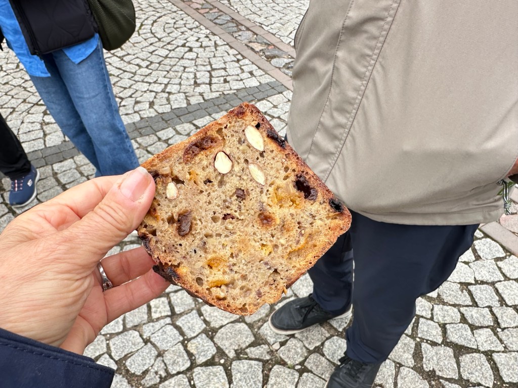 Andrew bought some of the local fruit and nut bread for us to try – it was just delicious! Also some fresh strawberries – so deliciously sweet, plus an Estonian dessert – it was like a cheesecake coated in chocolate- also sweet.