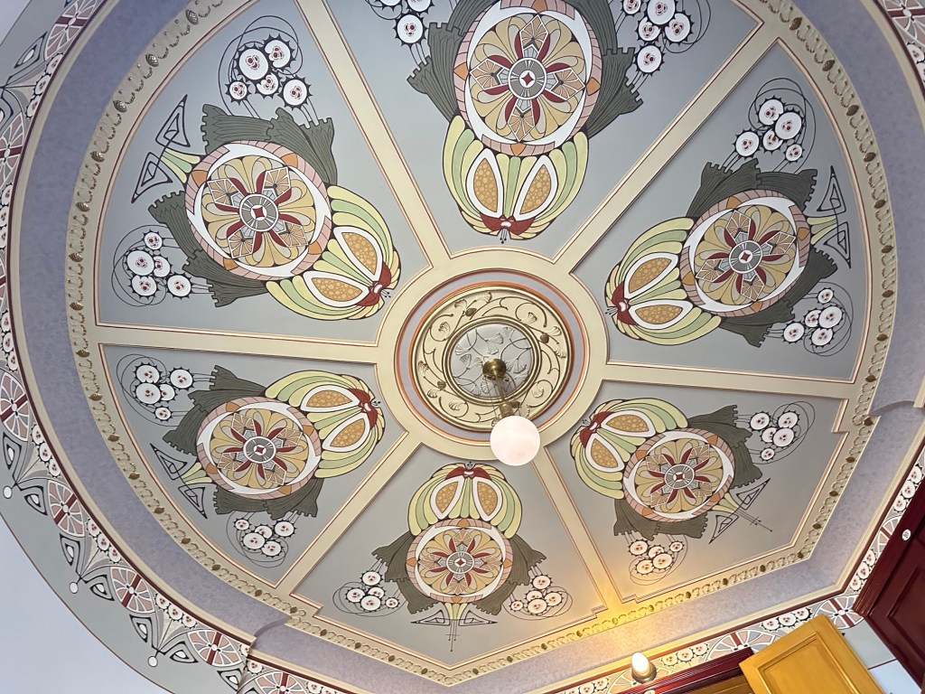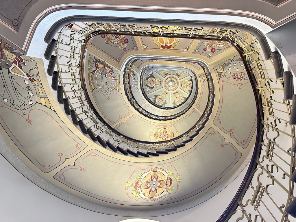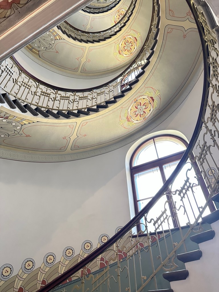 Refueled we walked back along the canal to Alberta Street to visit Art Nouveau Museum. The museum is housed in the former apartment of the building’s architect, Konstantins Peksens, who lived there around 1900. The decorated five floor spiral staircase is a work of art in itself.